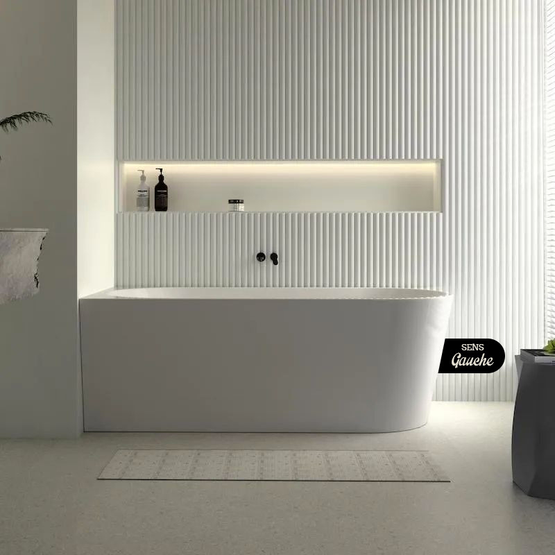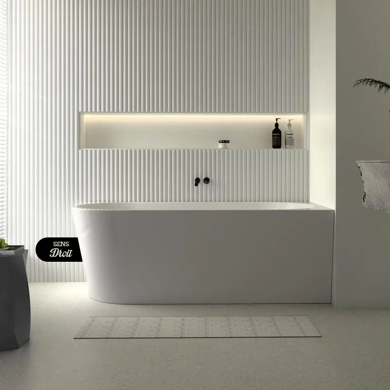 Cette baignoire unique en son genre s'intègre harmonieusement dans un coin de votre salle de bain, offrant un espace précieux et une ambiance de spa moderne.