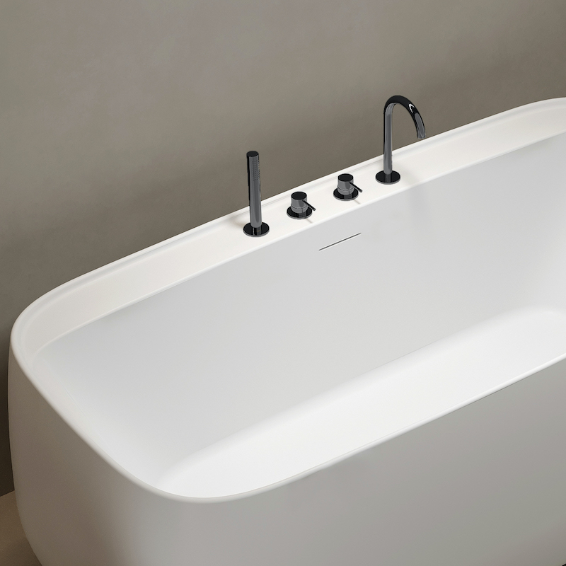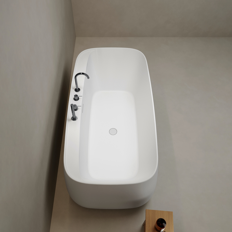 La baignoire îlot dispose d’une plage non percée, offrant différentes options d’installation : il est possible de poser un robinet sur plage (le perçage se fait facilement avec une scie cloche), ou d’utiliser un robinet sur pied selon vos préférences. La plage permet également de poser des produits de bain comme gel douche ou shampoing, ce qui n’est pas possible sur une baignoire îlot classique.