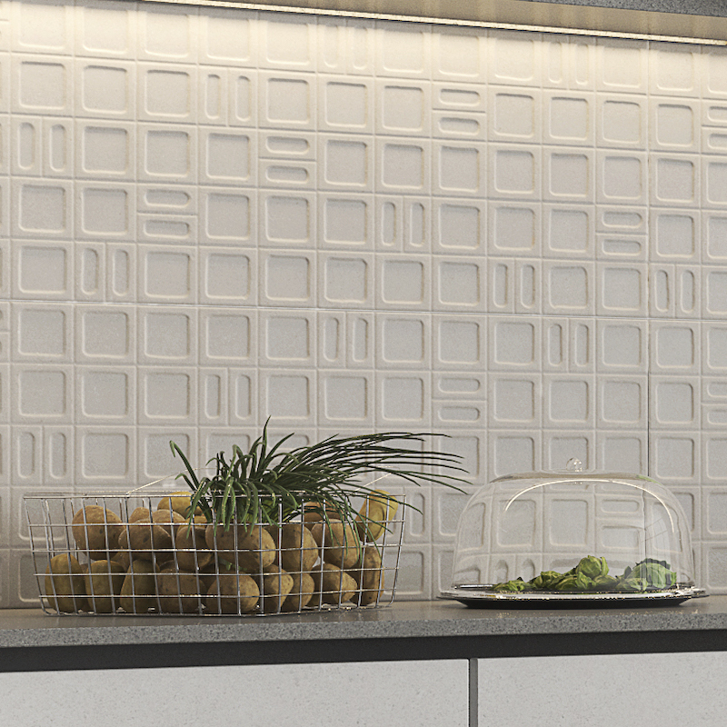 Gravel Relief Square allie l’élégance du ciment mat à un relief 3D graphique de carrés creusés. Quatre teintes naturelles pour un mur contemporain et structuré.