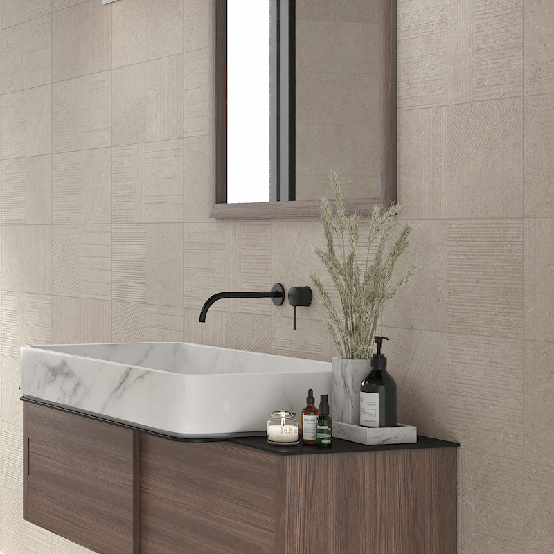 Idéale pour habiller une douche, un mur de cuisine ou une tête de lit, la série Kalksten Mure marie parfaitement relief tactile et esthétique sobre.
