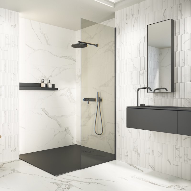 La faïence marbre Luna blanca, qui mesure 40 cm x 120 cm, est idéale pour être utilisée comme revêtement mural car elle permet de couvrir facilement une grande surface avec peu de carreaux.
