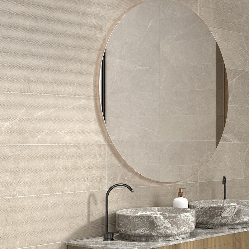Son design géométrique structuré évoque la pierre travaillée avec précision, idéale pour habiller une salle de bain, un mur de salon ou de cuisine avec modernité. Décliné en cinq teintes naturelles — Cream, Cloud, Earth, Grey et White — il s’associe facilement aux autres matériaux.