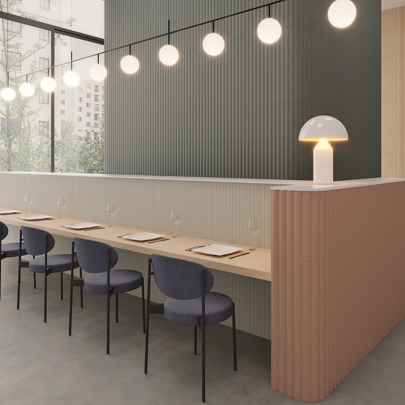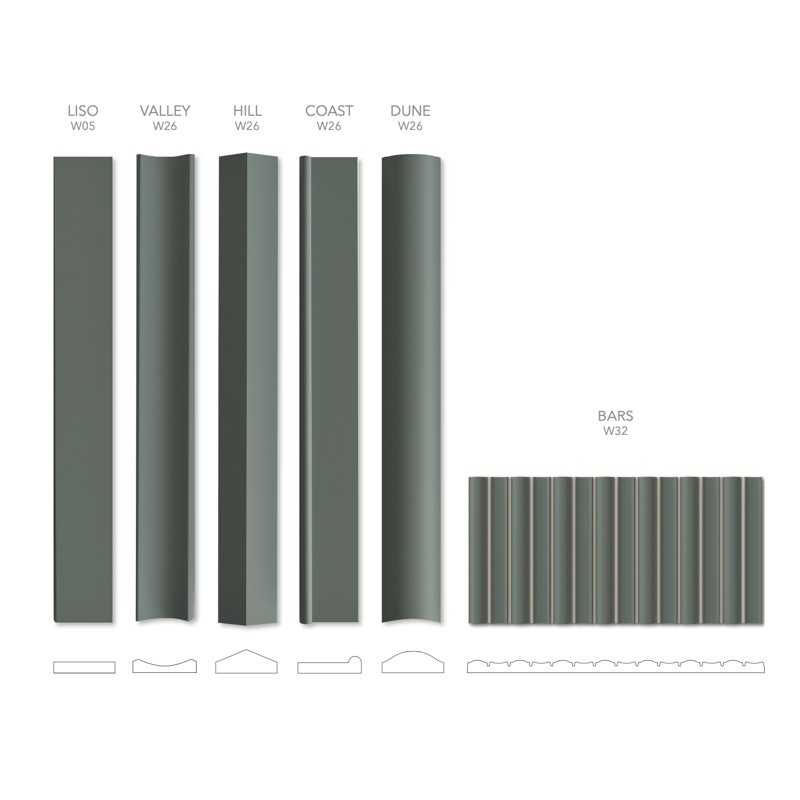 Laissez libre cours à votre créativité avec 6 formats distincts. Liso pour une simplicité épurée ; Coast pour une élégance biseautée ; Hill, l'ondulation douce ; Valley, les stries raffinées ; Dune, le mouvement des vagues ; Bars, l'audace des rayures. Chaque format se prête à une multitude de combinaisons et d'applications, permettant une expression architecturale unique.