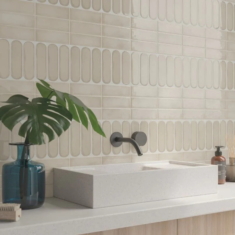 Avec son format 5 x 15 cm et sa forme ovale, il apporte relief et élégance à tous types d'espaces. La collection se décline en cinq coloris : Basil, Kohl, Azure, Ash – tous avec une finition ultra brillante, ainsi que Adobe, une teinte mate au charme naturel et à l’aspect terre cuite.