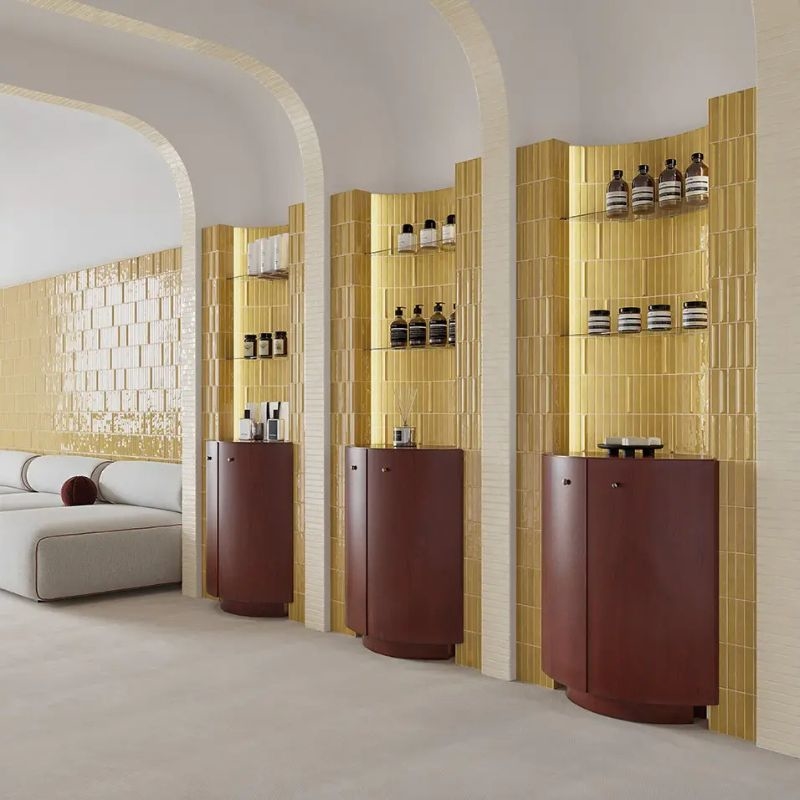Chaque carreau mêle tradition décorative et langage contemporain de la céramique : les lignes allongées, les finitions mates ou brillantes et les coloris riches évoquent le luxe discret et la délicatesse des matériaux nobles.