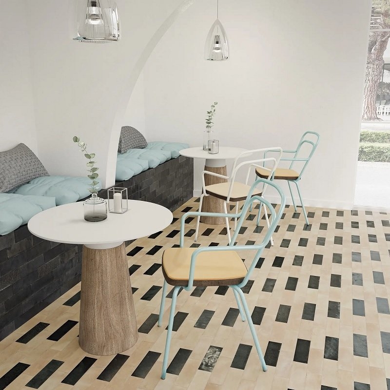 Les couleurs Biscuit et Tan reproduisent les Bejmat en argile cuite naturelle, quant aux coloris : White, Lake, Lemonade, Azur, Carmin, Olive et Ebony, ils reproduisent les carreaux en terre cuite émaillée.