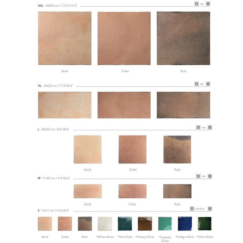 | Couleur | Sand mat, Cotto mat, Rust mat, White gloss, Turques gloss, Honey gloss, Indigo gloss, Olive gloss et Teal gloss |