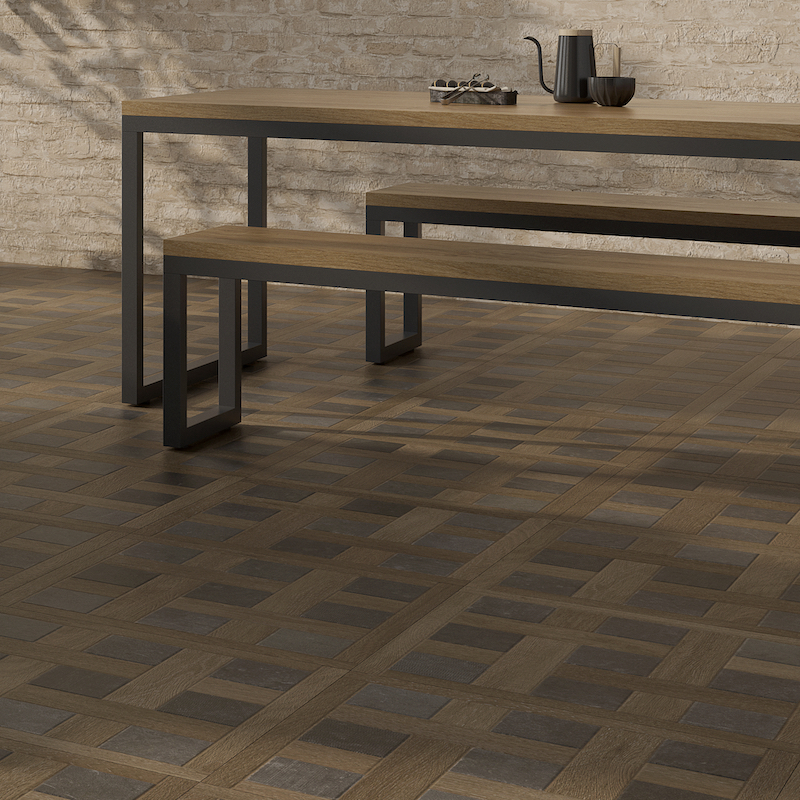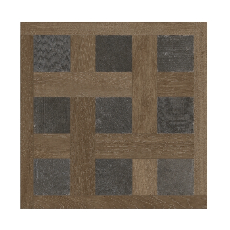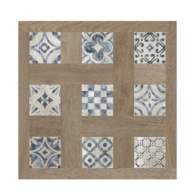 Atelier est un carrelage 60x60 cm effet bois, orné de carrés façon ciment ou de motifs décoratifs. Finition mate, grès cérame UGL, pâte STD, pour un sol unique.