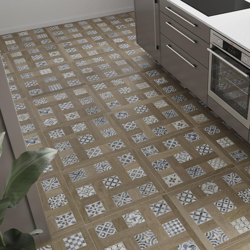 Atelier Stone marie l’aspect bois brut avec des impressions façon carreaux de ciment, pour un effet vintage assumé, parfait dans une cuisine ou une entrée.