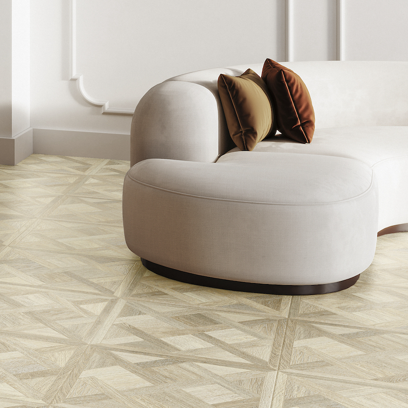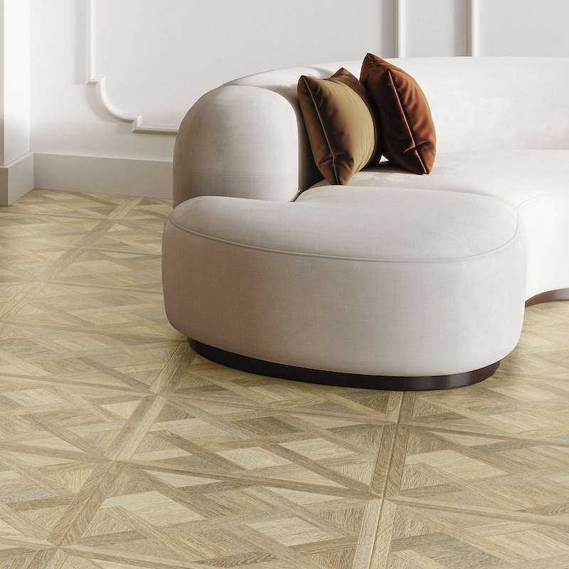 Ce jeu de formes crée un rendu raffiné et graphique, parfait pour donner du caractère à vos sols. Disponible en quatre teintes chaleureuses — Décapé (blanchi), Oak (chêne naturel), Cream (beige doux) et Walnut (noyer profond) — Versailles allie esthétique et performance.