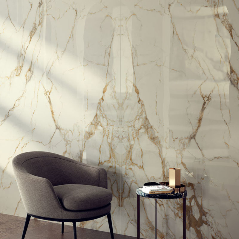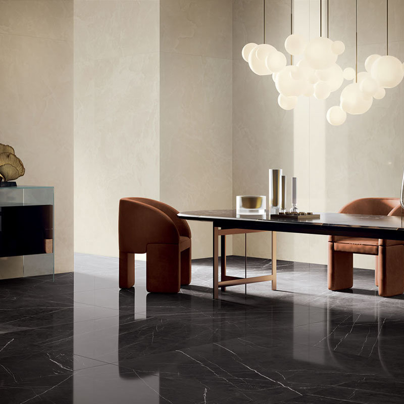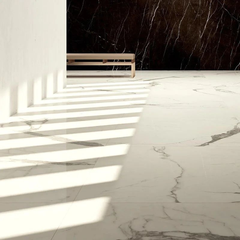 Les carreaux Vanity en grès cérame effet marbre sont disponibles en 60x120 et 120x120 cm, épaisseur 6.5 mm, avec finition polie ou mate, alliant élégance et performance.