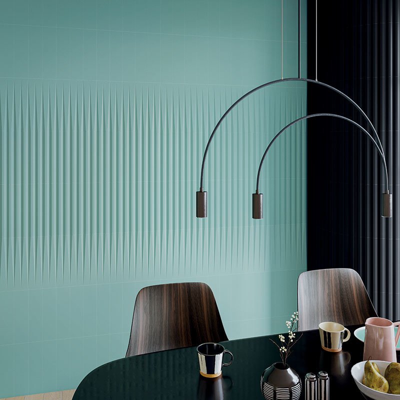 Dessiner des espaces harmonieux et modernes est maintenant possible avec le carrelage 3D rectangulaire en pâte blanche Stripes Teal Mat.