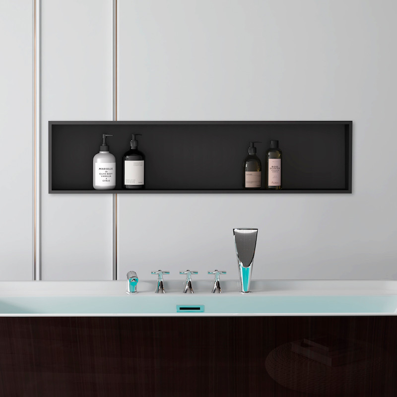 Optimisez vos contre cloison lors de la rénovation de votre salle de bain en insérant une niche de douche noir mat en acier inoxydable, pour une salle de bain plus rangé. La niche encastrable noir mat est disponible en 90 cm x 20 cm.