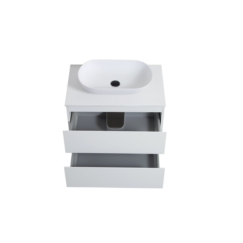 Le plan de toilette ultra slim en résine et charges minérales présente une épaisseur de 1,5 cm et une finition blanche mate. Il est non percé, ce qui permet de choisir librement le type de robinet (mural ou sur plage) ainsi que l’emplacement de la vasque. Le perçage se réalise facilement à l’aide d’une scie-cloche adaptée.