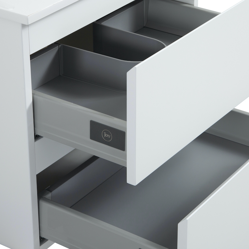 Les deux grands tiroirs métalliques à frein progressif assurent un rangement optimal et une fermeture silencieuse. L’ouverture passe-main à 45° permet une prise en main pratique tout en conservant une façade épurée.