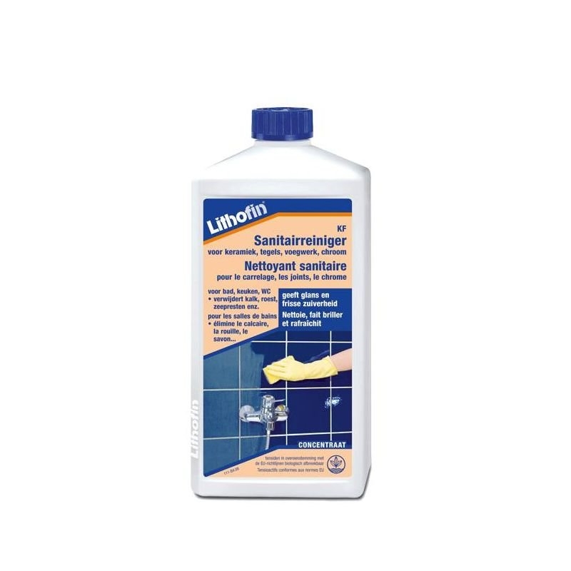 Le Lithofin KF nettoyant sanitaire est un concentré qui renferme une combinaison équilibrée d'agents nettoyants puissants et d'acides actifs. Son action se veut profonde et douce avec une odeur agréable et après son rinçage à l'eau, il ne laisse aucun résidu.