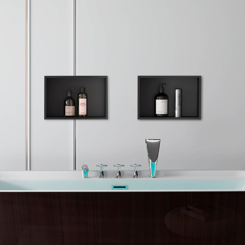 Optimisez vos contre cloison lors de la rénovation de votre salle de bain en insérant une niche de douche noir mat en acier inoxydable, pour une salle de bain plus rangé. La niche encastrable noir mat est disponible en 2 tailles : 30 cm, 60 cm.