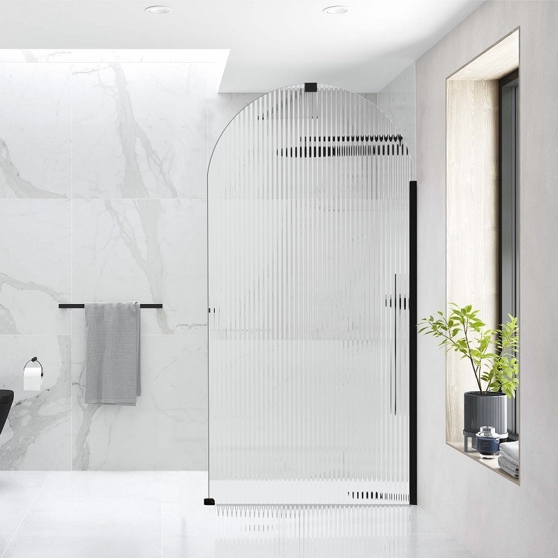 La paroi de douche Flûte avec verre 8 mm cannelé en forme d'arche. Disponible en 3 tailles : 90 cm, 110 cm, 120 cm et en 6 coloris : chromé brillant, doré, noir mat, bronze brossé, gun métal, blanc mat.