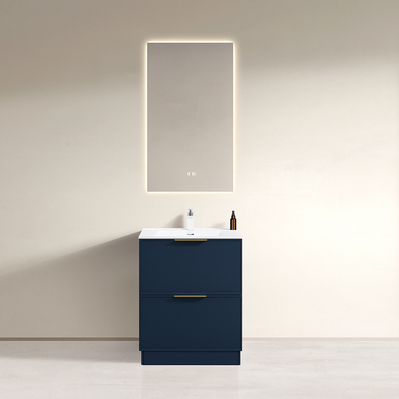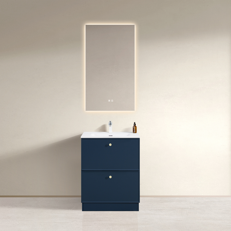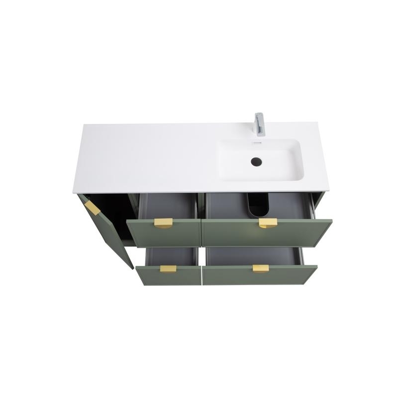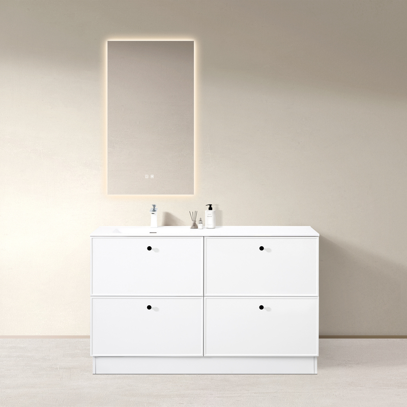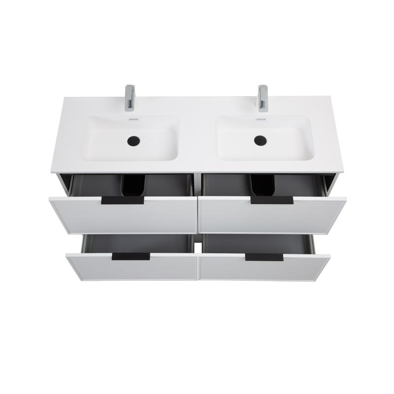 Les façades sont rehaussées d’un liseré en relief 3D qui souligne tout le pourtour du tiroir. Les tiroirs métalliques (pour les modules de 70 et 40 cm) sont robustes, profonds et équipés d’une fermeture amortie. Ce meuble offre une capacité de rangement supérieure aux modèles suspendus grâce à sa hauteur totale.