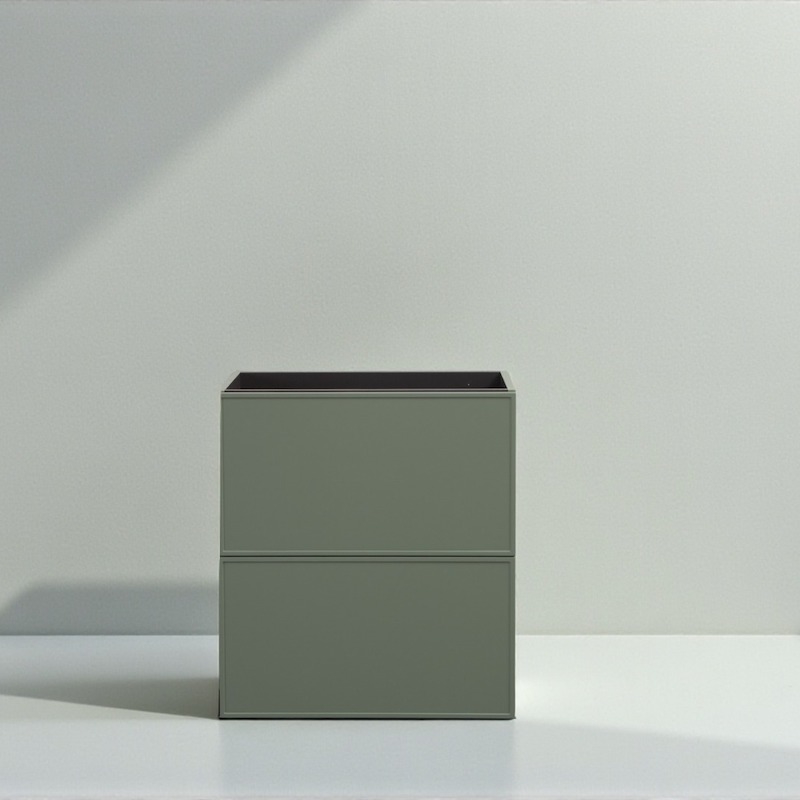 Le meuble Feety offre un espace de rangement généreux grâce à ses deux grands tiroirs sur toute la hauteur, parfaits pour organiser produits de toilette, accessoires et linge de bain. Les tiroirs sont montés sur des coulisses métalliques solides et équipés d’un système de fermeture douce, assurant une utilisation fluide et silencieuse au quotidien. Le caisson du haut intègre une ouverture prévue pour le passage du siphon.