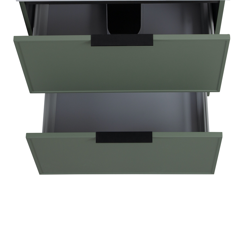 La version mate est disponible dans une gamme de coloris tendance entièrement mats : sauge, blanc, bleu marine et terra. Le pourtour des deux tiroirs est souligné par un liseré en relief 3D