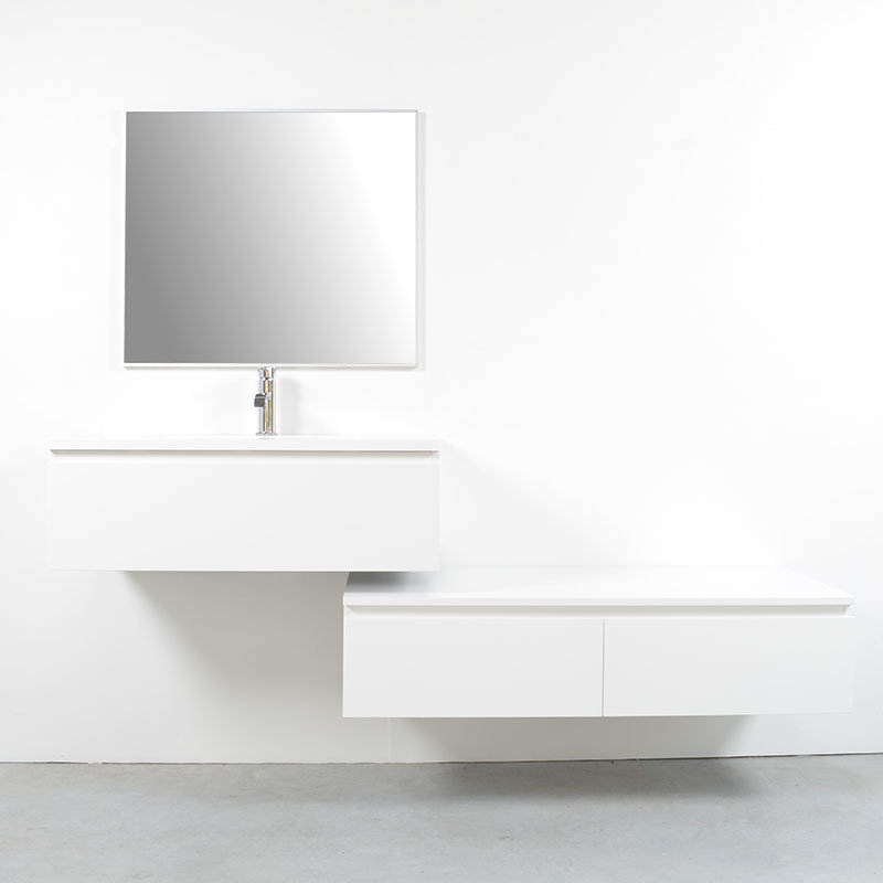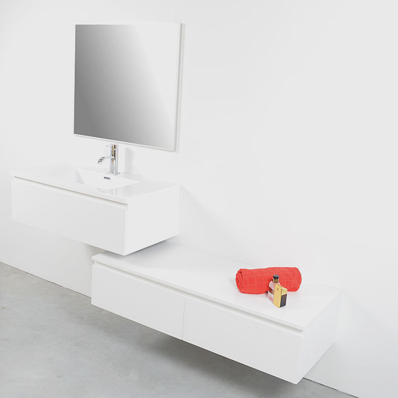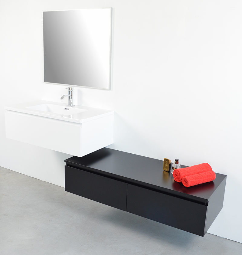 La vasque, en acrylique blanche ou noir, est encastrée dans un meuble de salle de bain SHEA de 90 cm de la même couleur. La finition mate du meuble forme un beau contraste avec la finition brillante ou mate de la vasque.