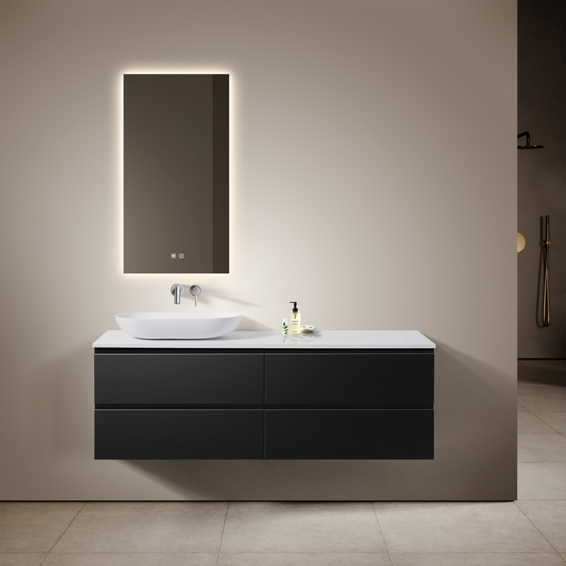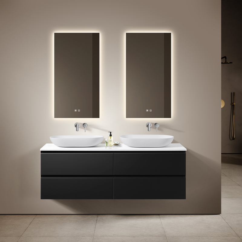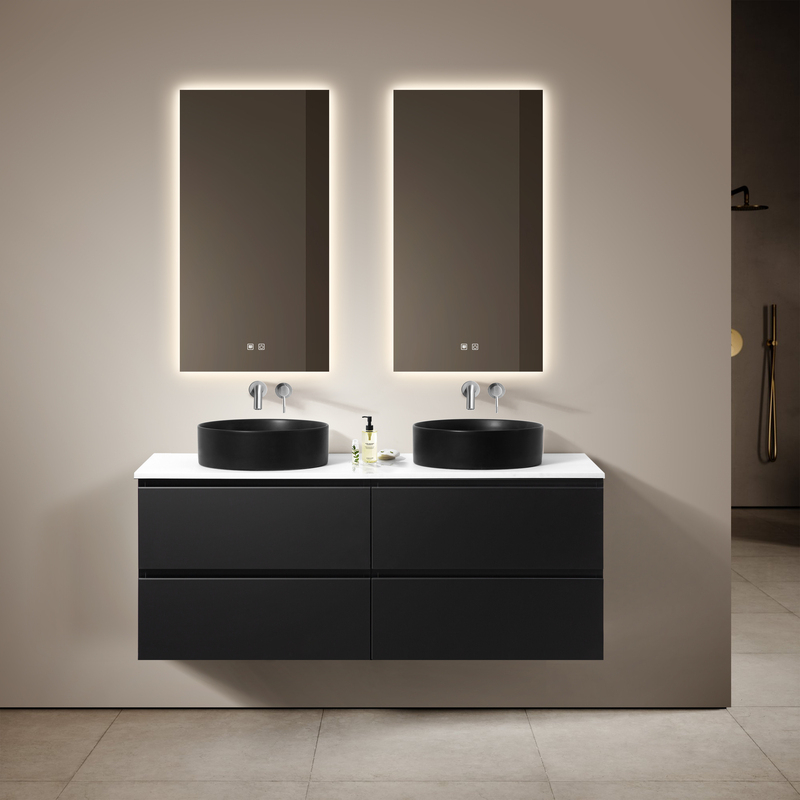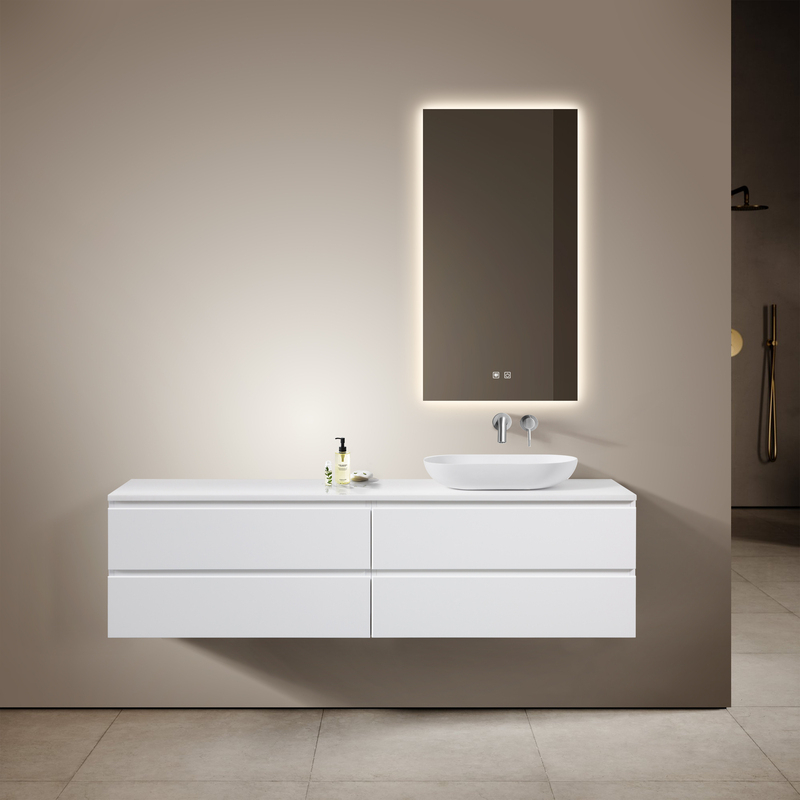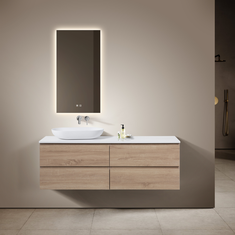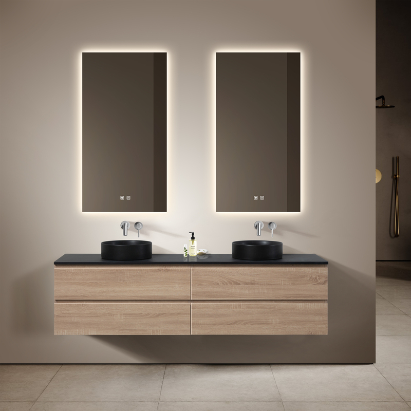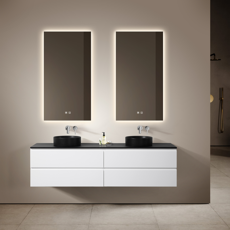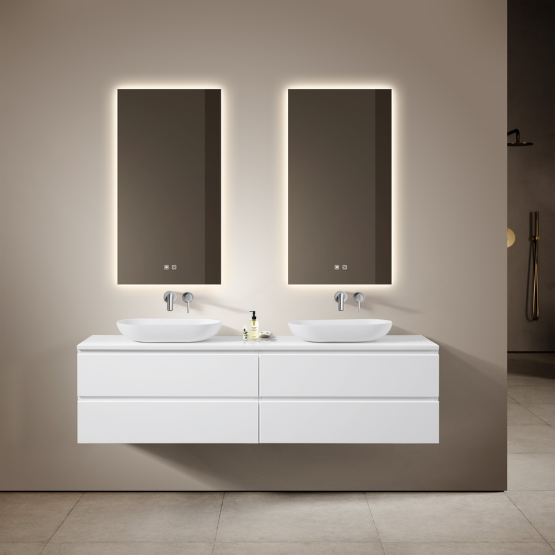 La structure du meuble est conçue en médium hydrofuge, adaptée aux environnements humides. Les tiroirs à fermeture douce sont montés sur coulisses métalliques DTC. Les poignées intégrées en coupe à 45° apportent une finition sobre et pratique.