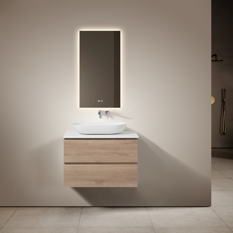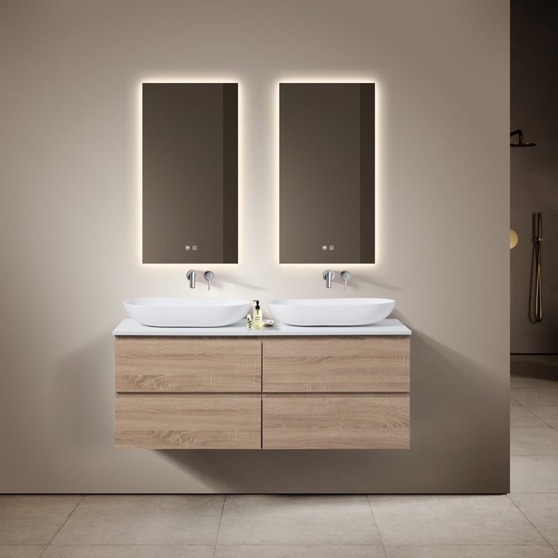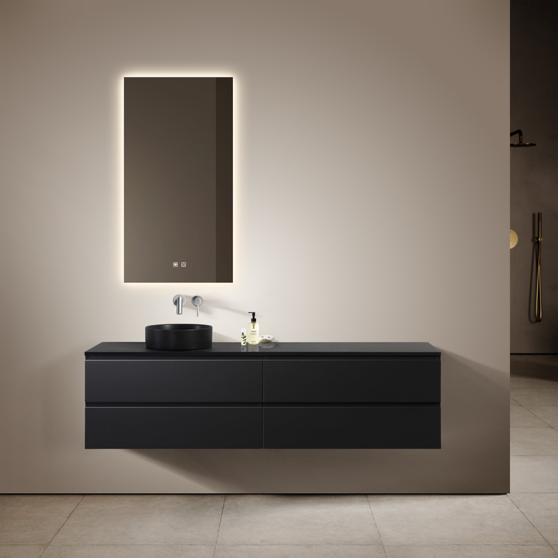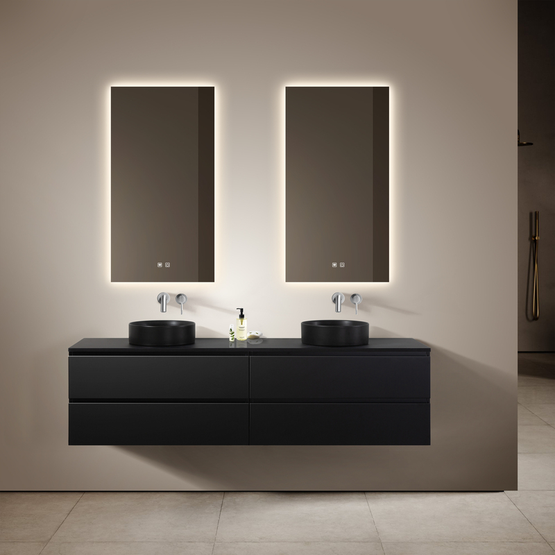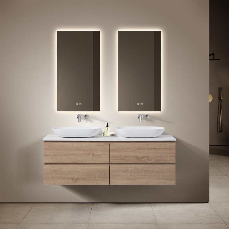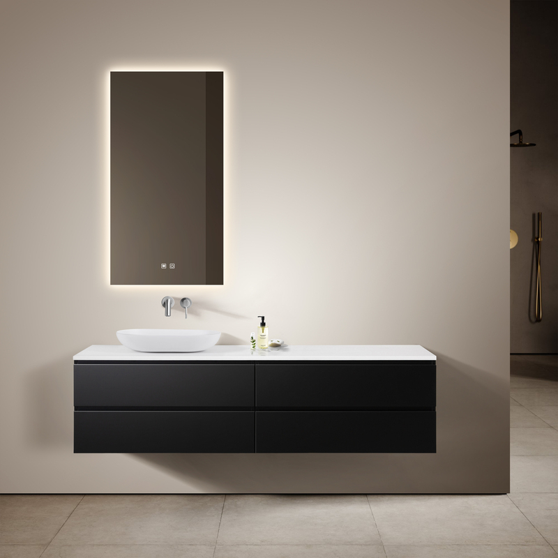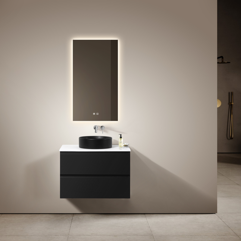 La structure du meuble est conçue en médium hydrofuge, adaptée aux environnements humides. Les tiroirs à fermeture douce sont montés sur coulisses métalliques DTC. Les poignées intégrées en coupe à 45° apportent une finition sobre et pratique.