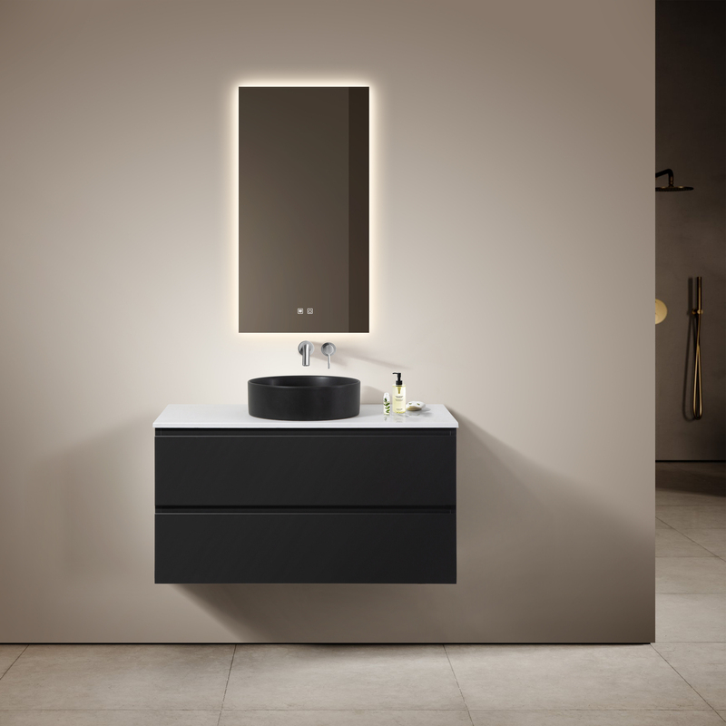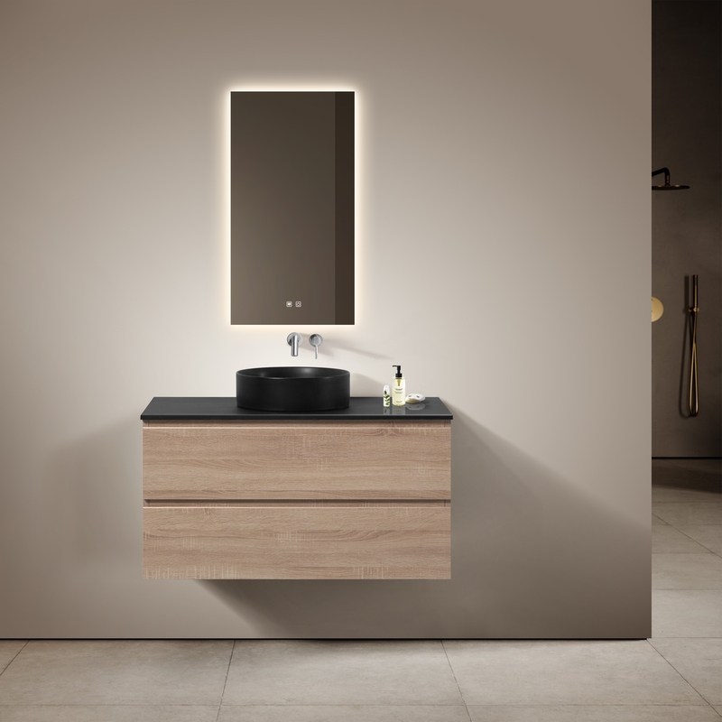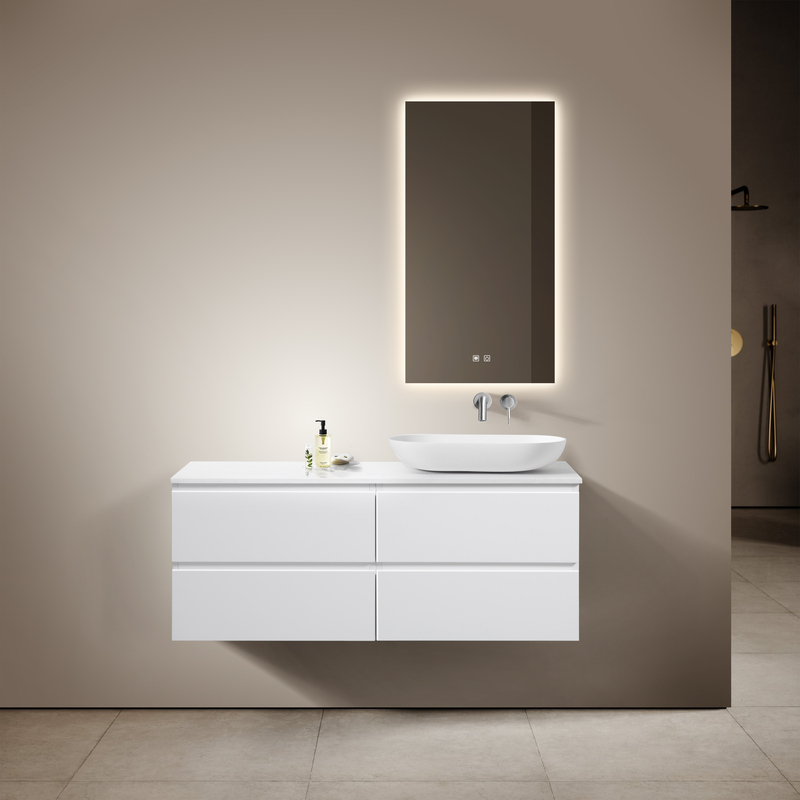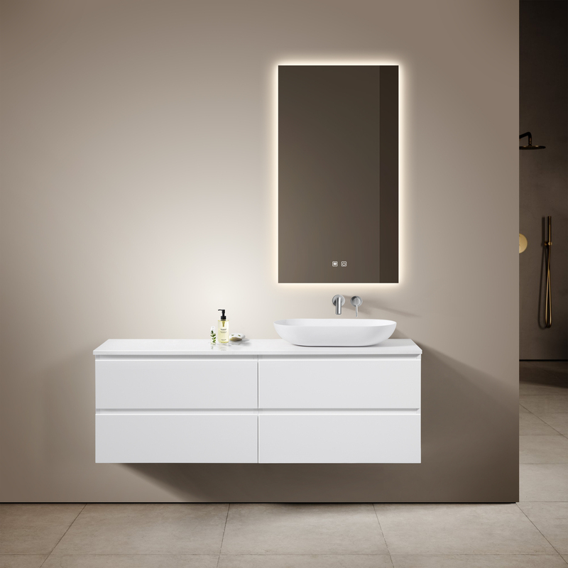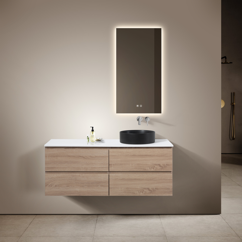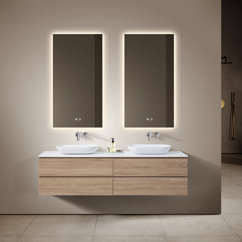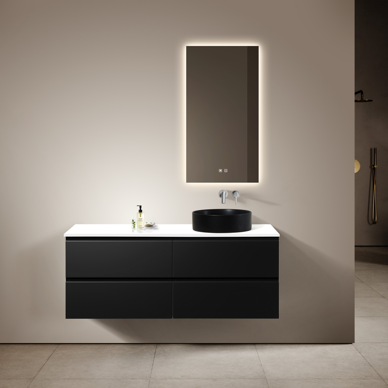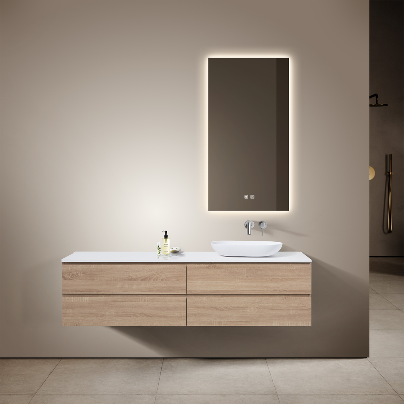 La structure du meuble est conçue en médium hydrofuge, adaptée aux environnements humides. Les tiroirs à fermeture douce sont montés sur coulisses métalliques DTC. Les poignées intégrées en coupe à 45° apportent une finition sobre et pratique.
