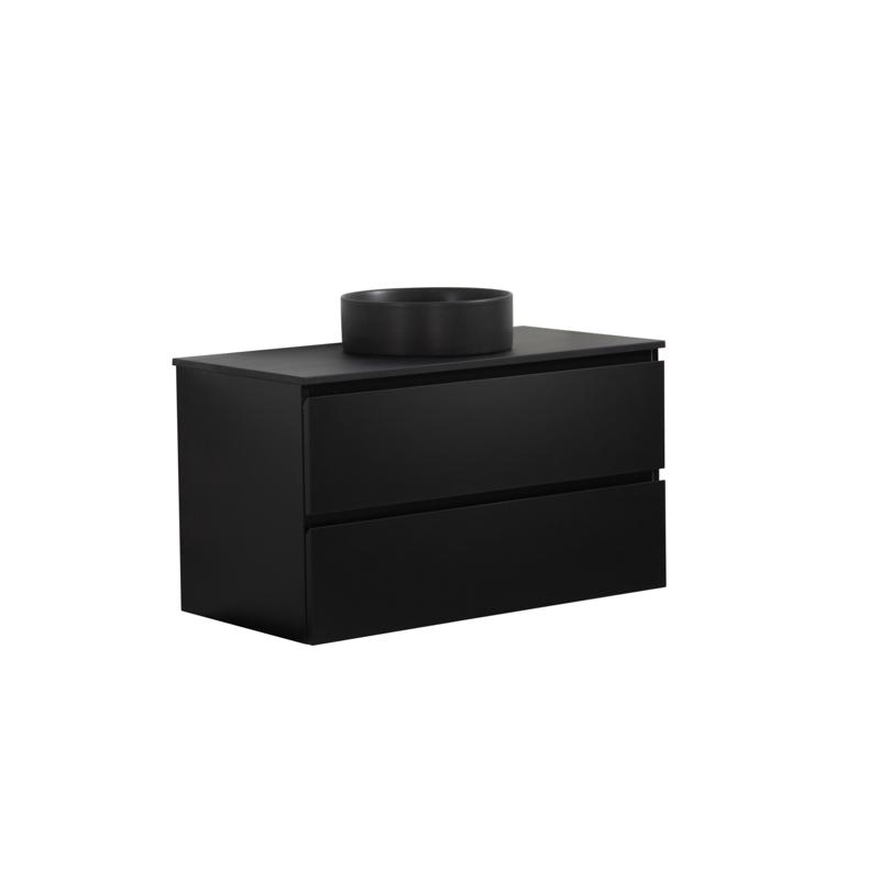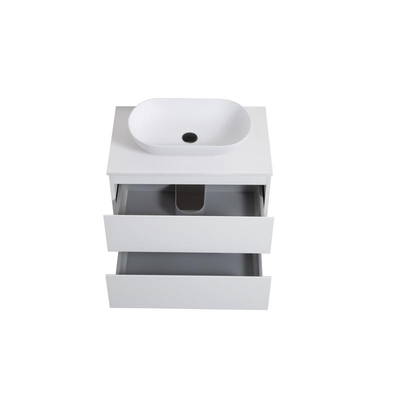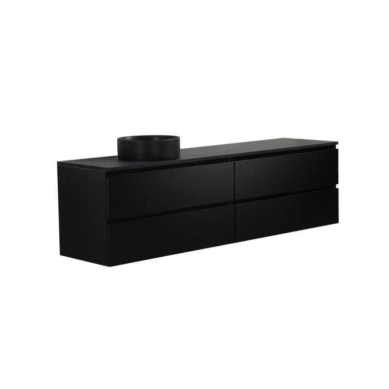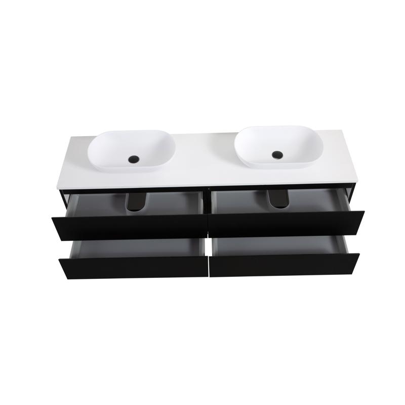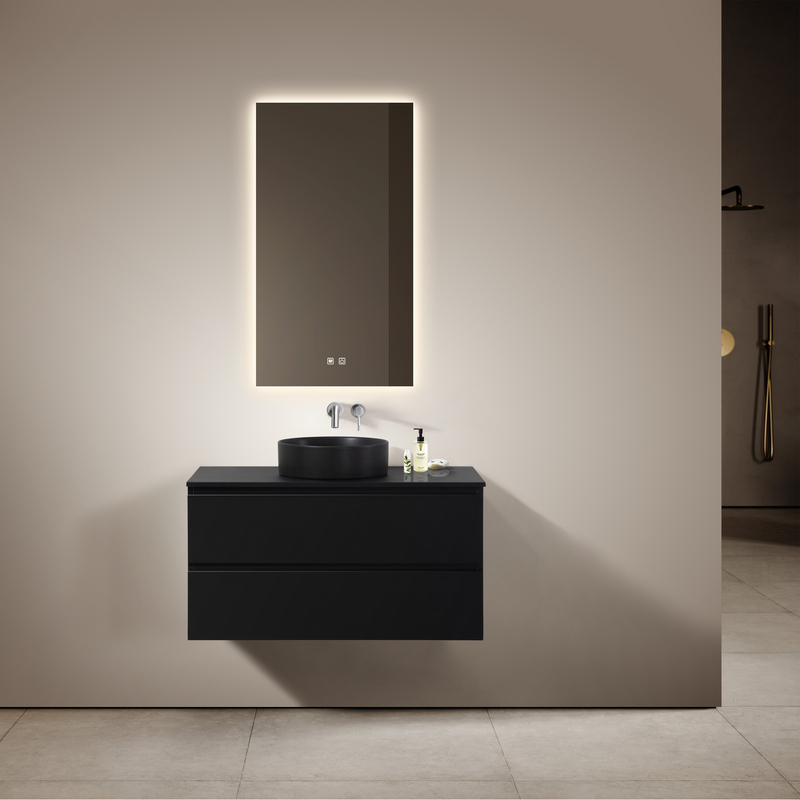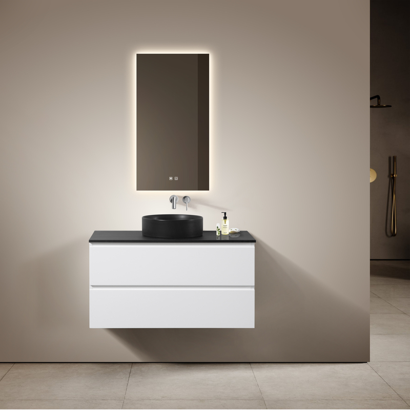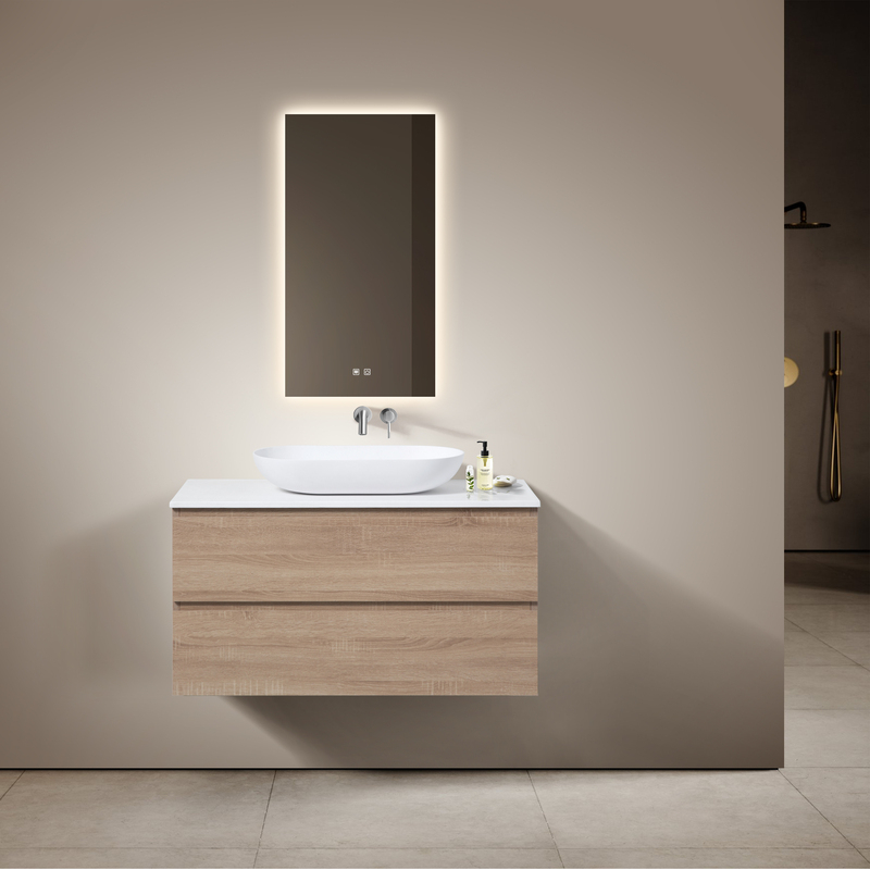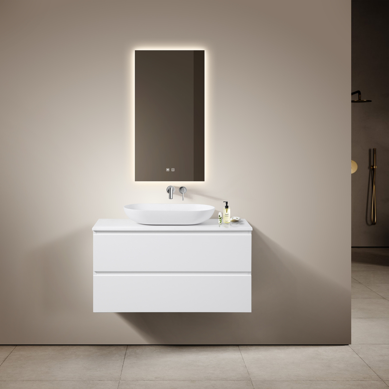 La structure du meuble est conçue en médium hydrofuge, adaptée aux environnements humides. Les tiroirs à fermeture douce sont montés sur coulisses métalliques DTC. Les poignées intégrées en coupe à 45° apportent une finition sobre et pratique.