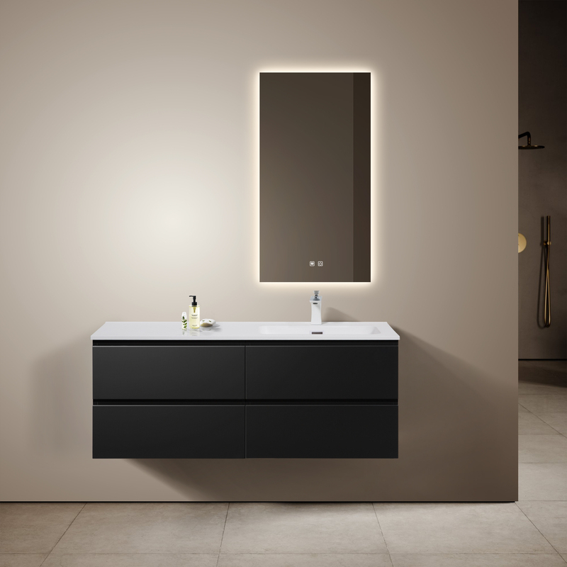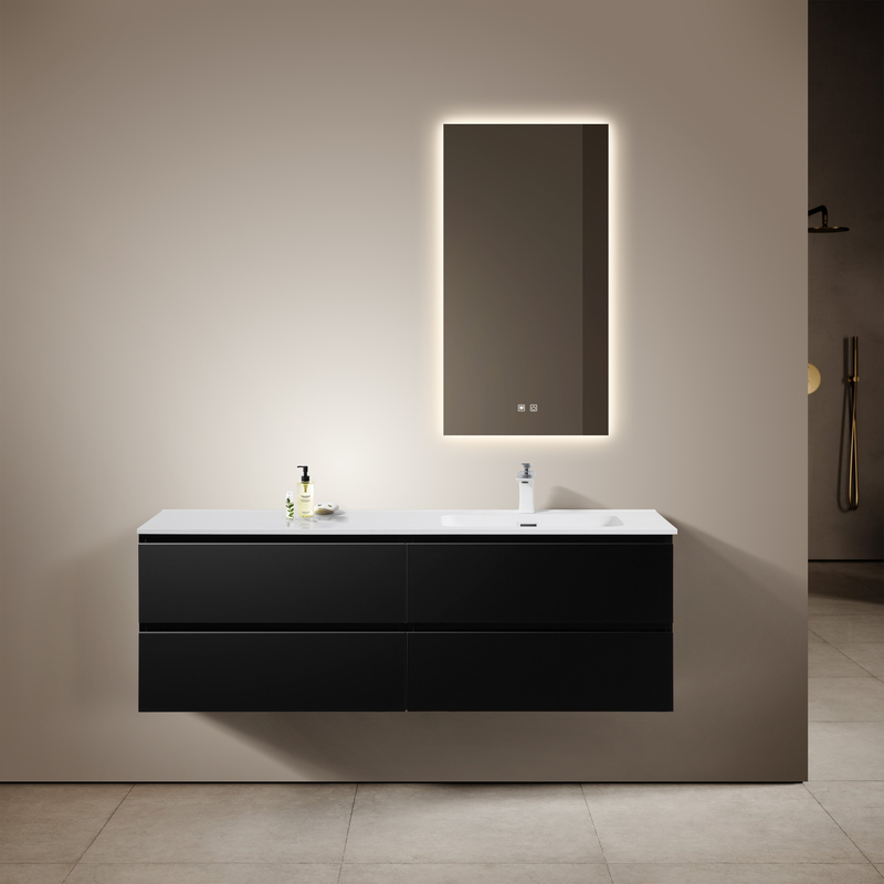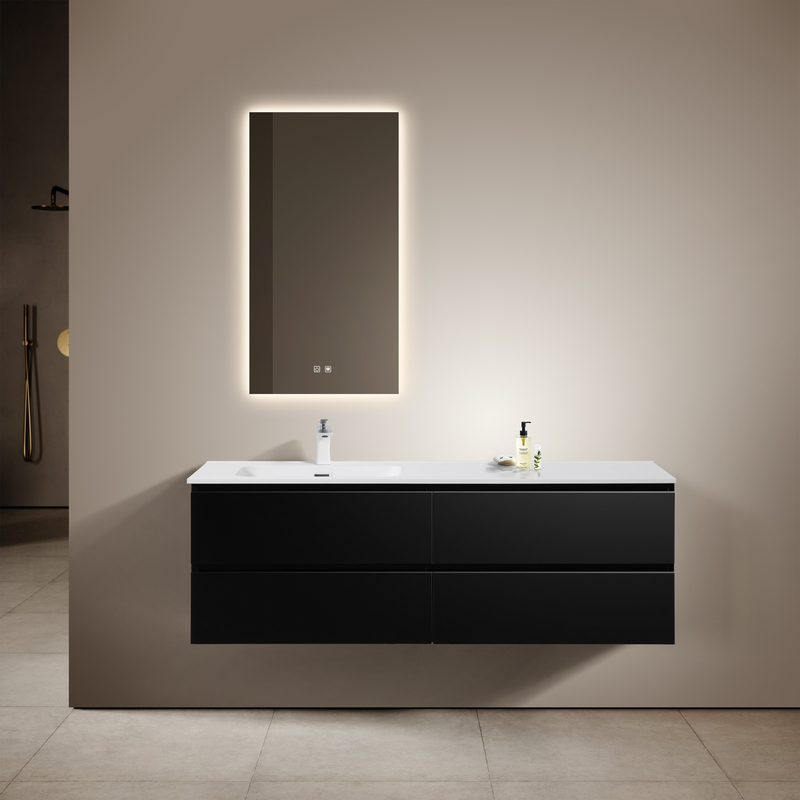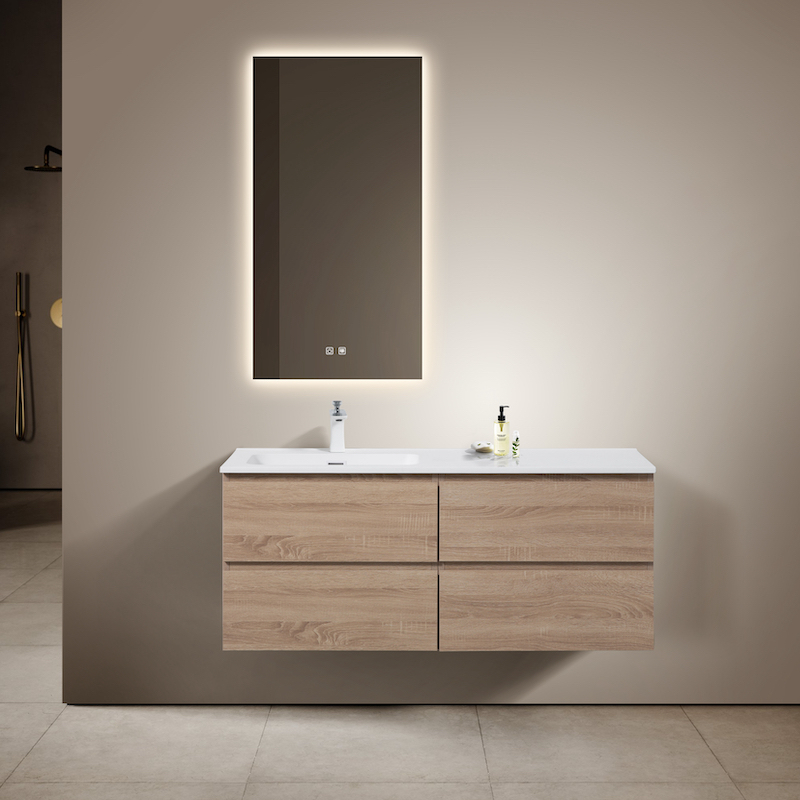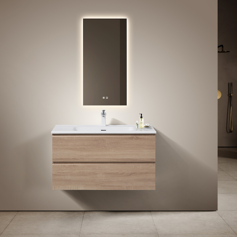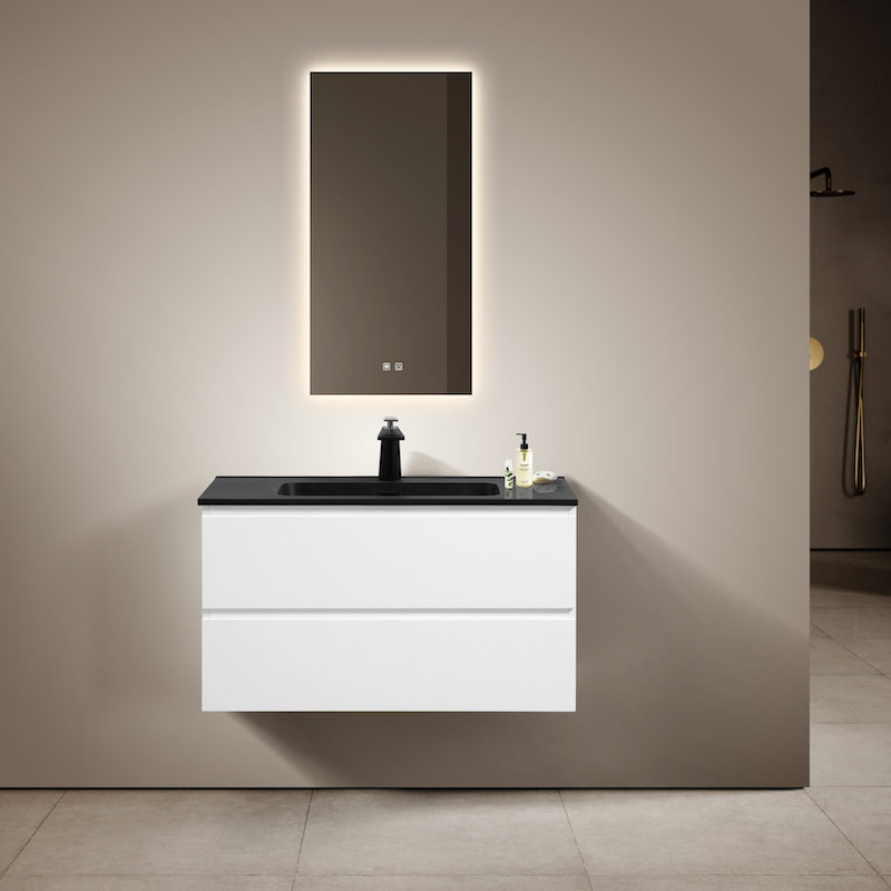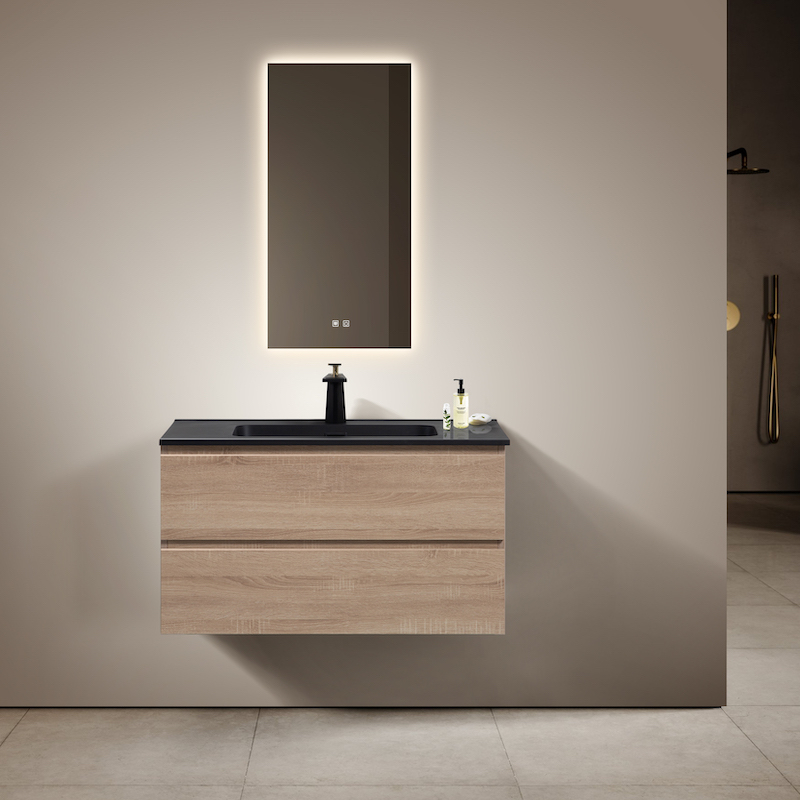 Trois finitions sont proposées : effet chêne vieilli scié, blanc mat et noir mat.Les finitions blanc mat et noir mat sont réalisées avec une véritable laque mate appliquée en trois couches, garantissant une excellente résistance. Le meuble est fabriqué en médium hydrofuge, un matériau spécialement conçu pour résister à l’humidité des environnements comme la salle de bain.
