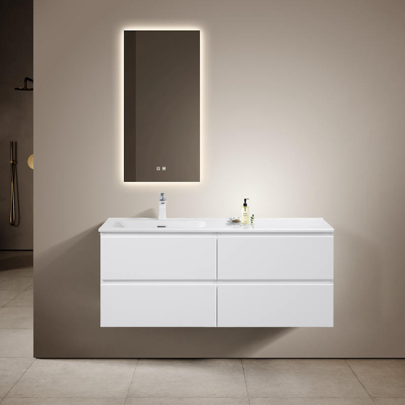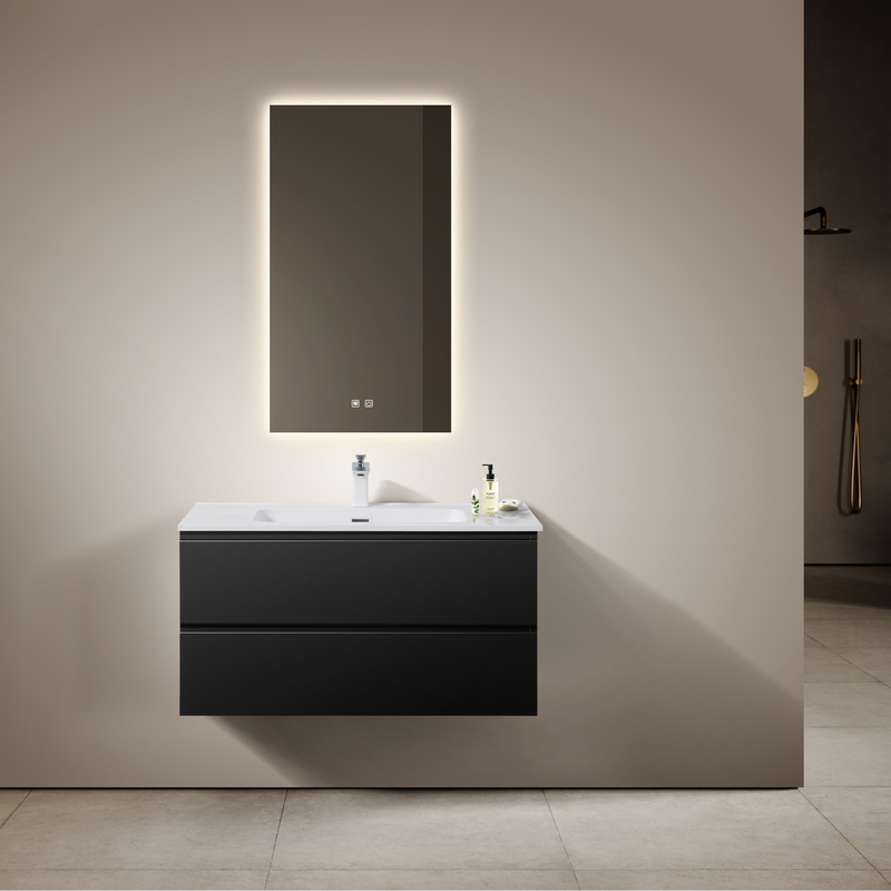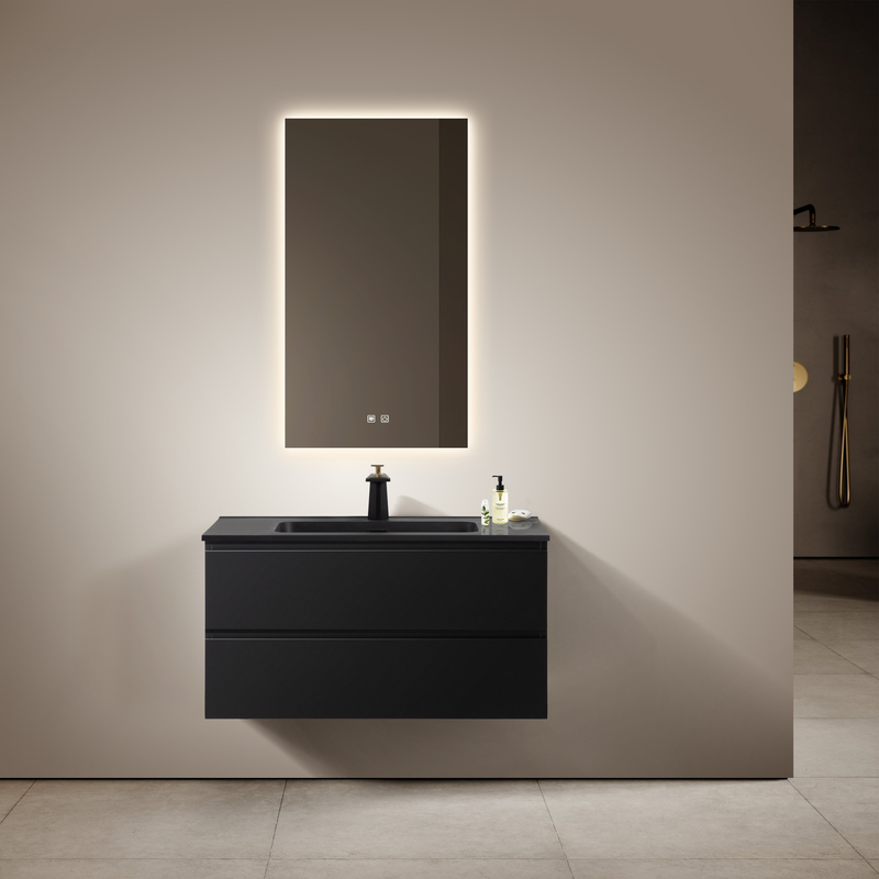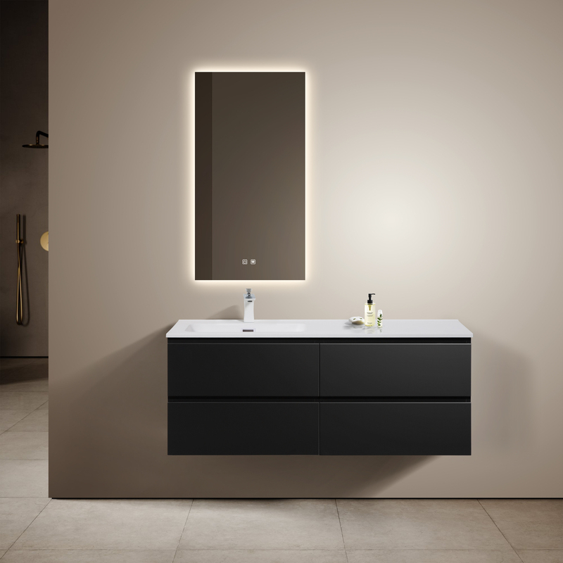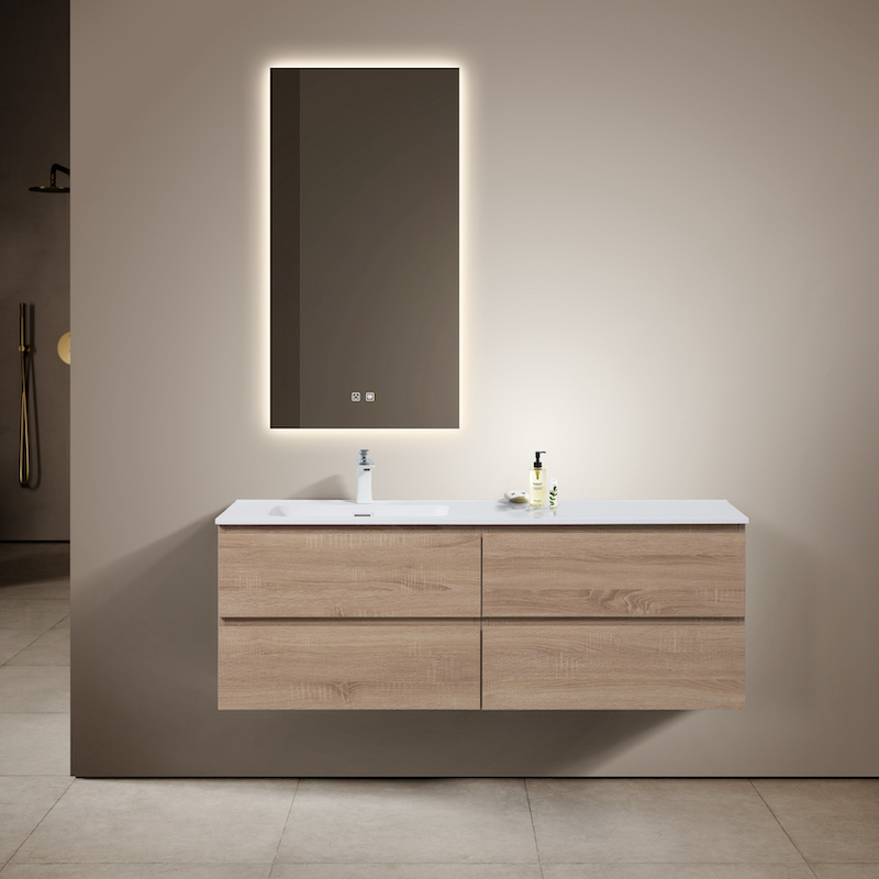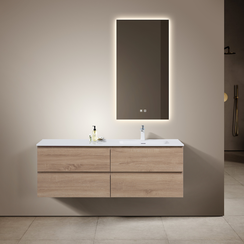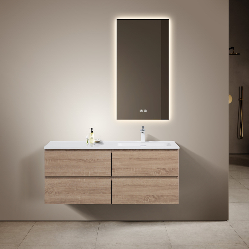 Trois finitions sont proposées : effet chêne vieilli scié, blanc mat et noir mat.Les finitions blanc mat et noir mat sont réalisées avec une véritable laque mate appliquée en trois couches, garantissant une excellente résistance. Le meuble est fabriqué en médium hydrofuge, un matériau spécialement conçu pour résister à l’humidité des environnements comme la salle de bain.