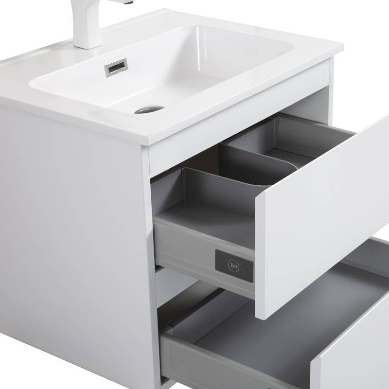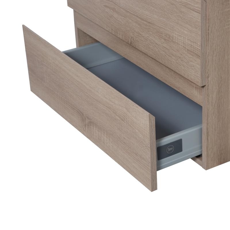 Côté praticité, Alia dispose de deux tiroirs métalliques robustes avec fermeture amortie soft-close. Sa poignée passe-main en coupe 45° complète son look moderne et minimaliste.