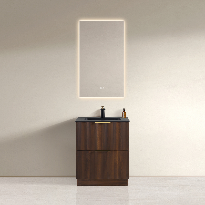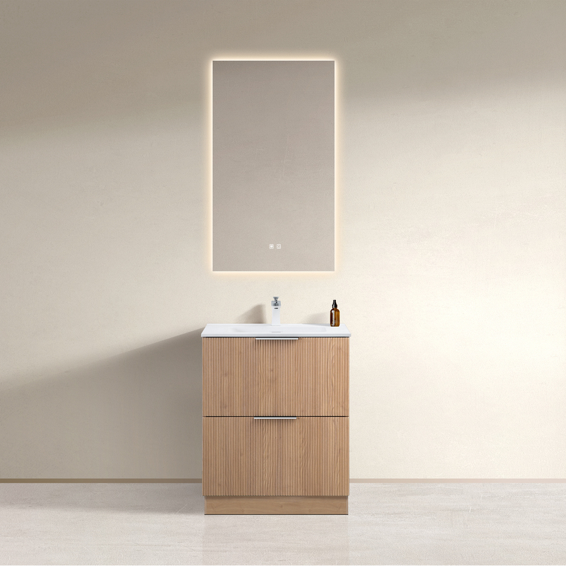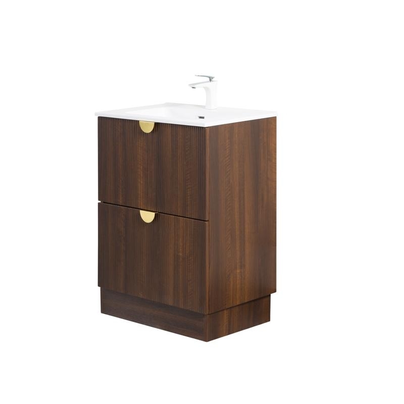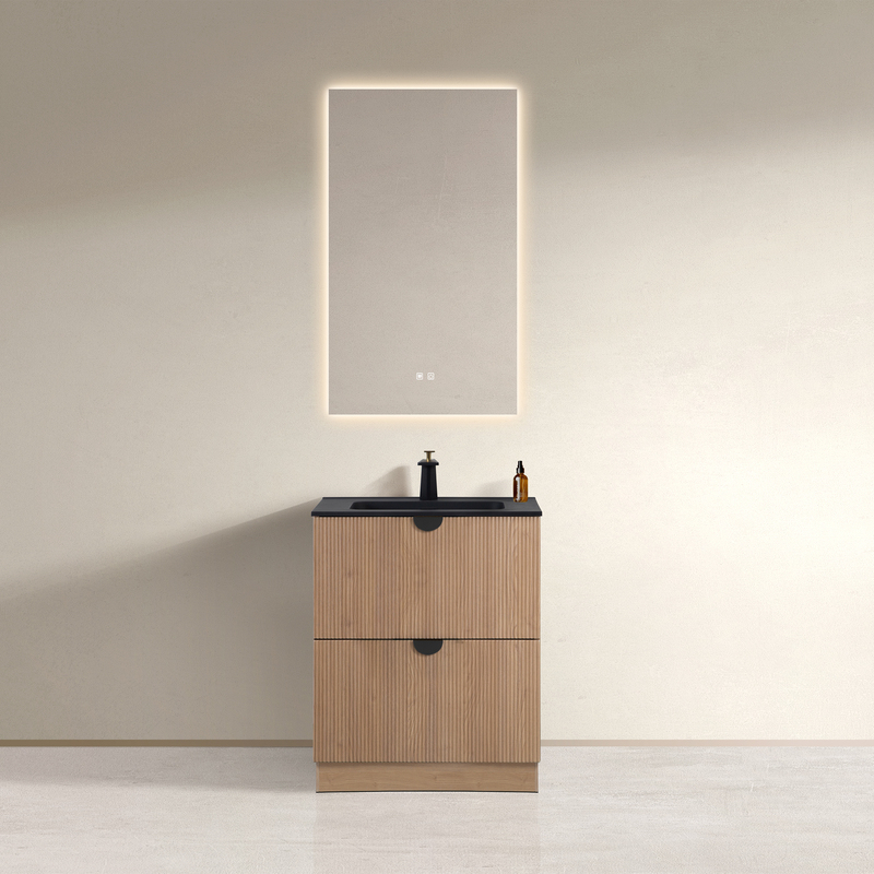 Le meuble Feety Cannelé de 70 cm avec sa façade en relief cannelé vertical est disponible en deux finitions bois : effet chêne clair ou noyer foncé. Vous pouvez choisir entre deux modèles de poignées : slim rectangle ou demi-lune, en plusieurs coloris selon le modèle.