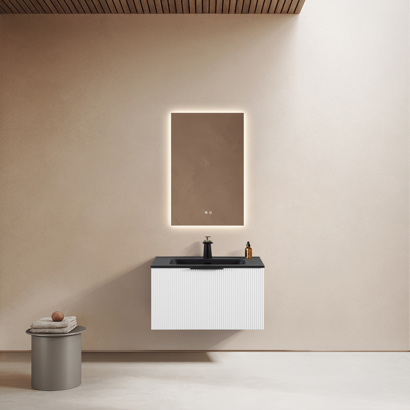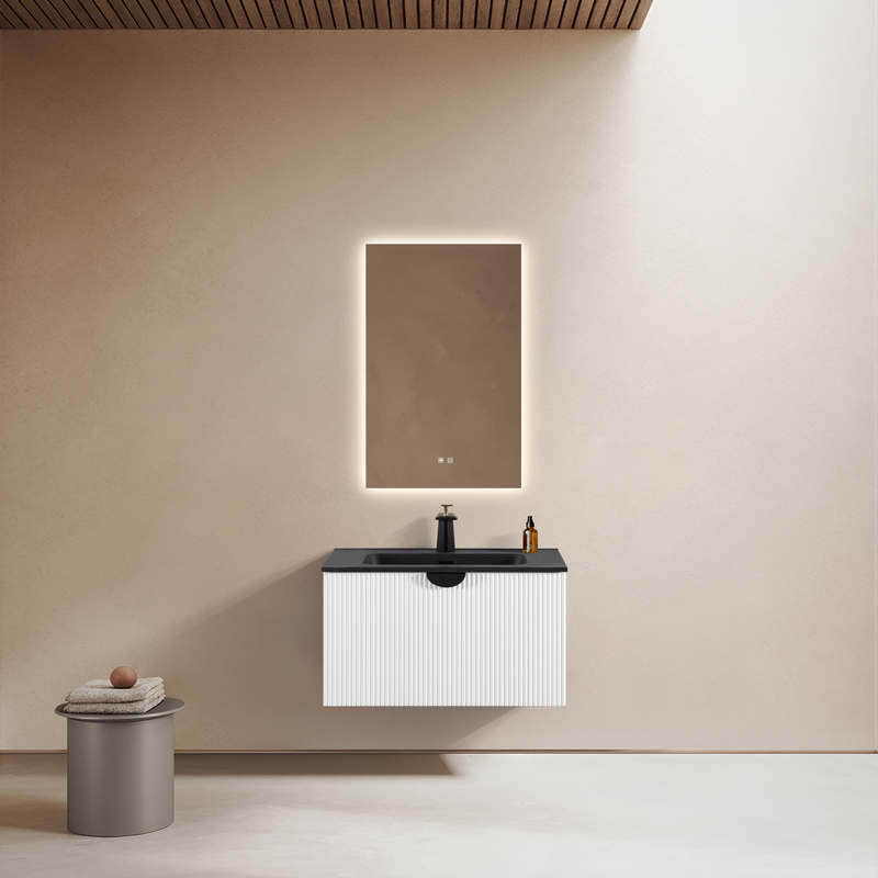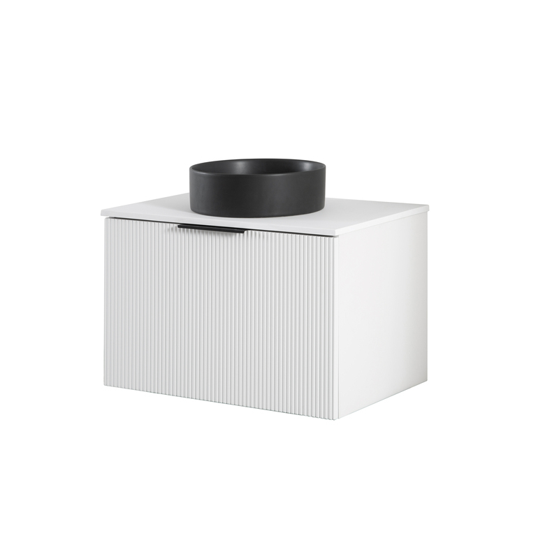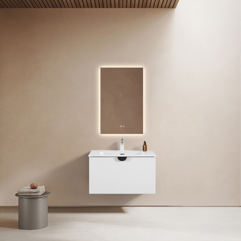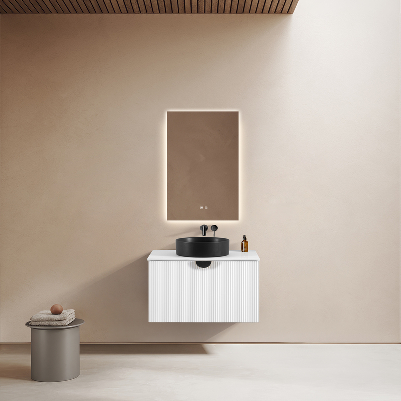 Envie d’un petit meuble cannelé ? Stripes 60 ou 70 cm se décline en 3 coloris, avec 2 modèles de poignées et plusieurs finitions de vasque.