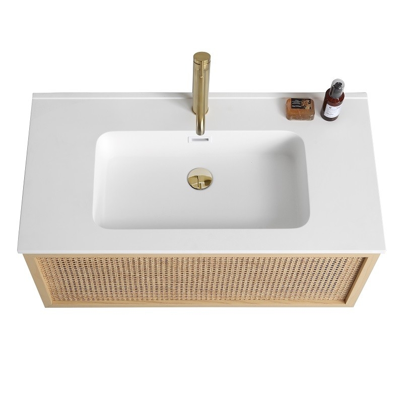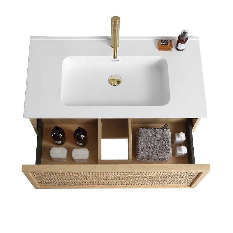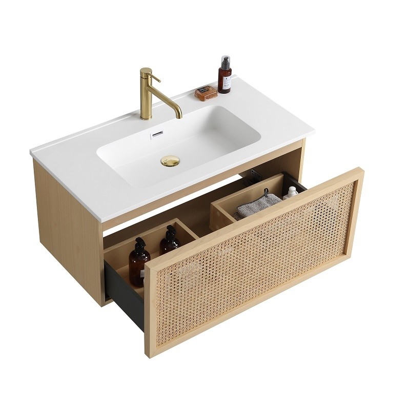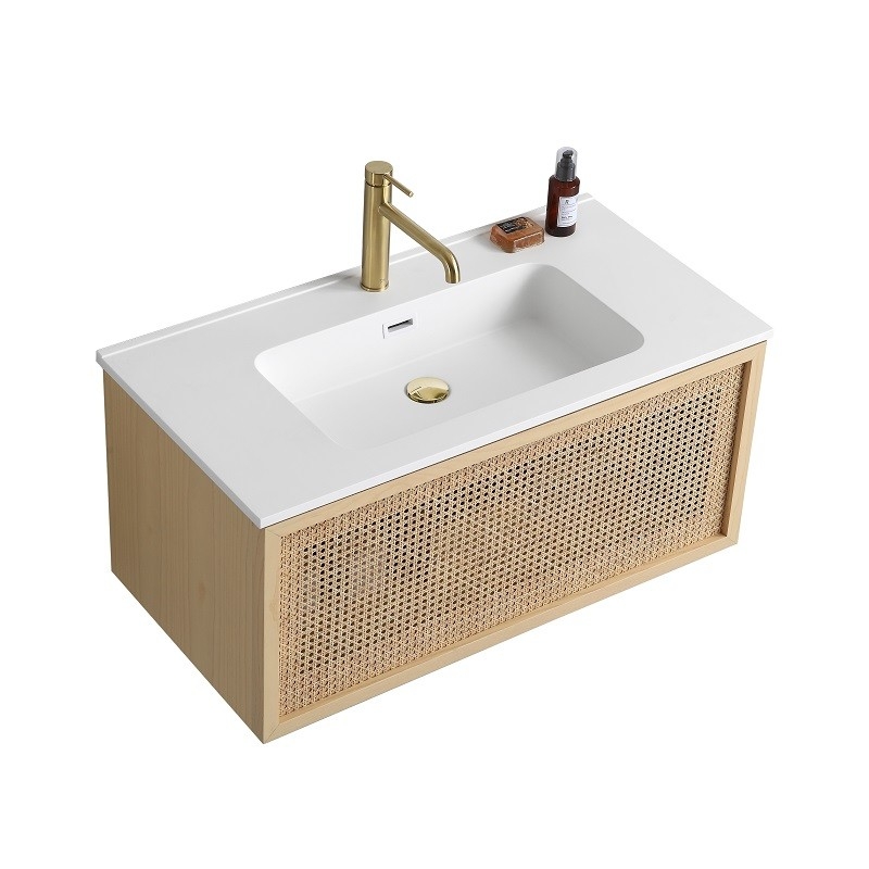 Si vous êtes à la recherche d'un meuble de salle de bain élégant et fonctionnel, ne cherchez pas plus loin que notre meuble suspendu de 90 cm de large en bois massif, avec placage en bambou et véritable raphia naturel.