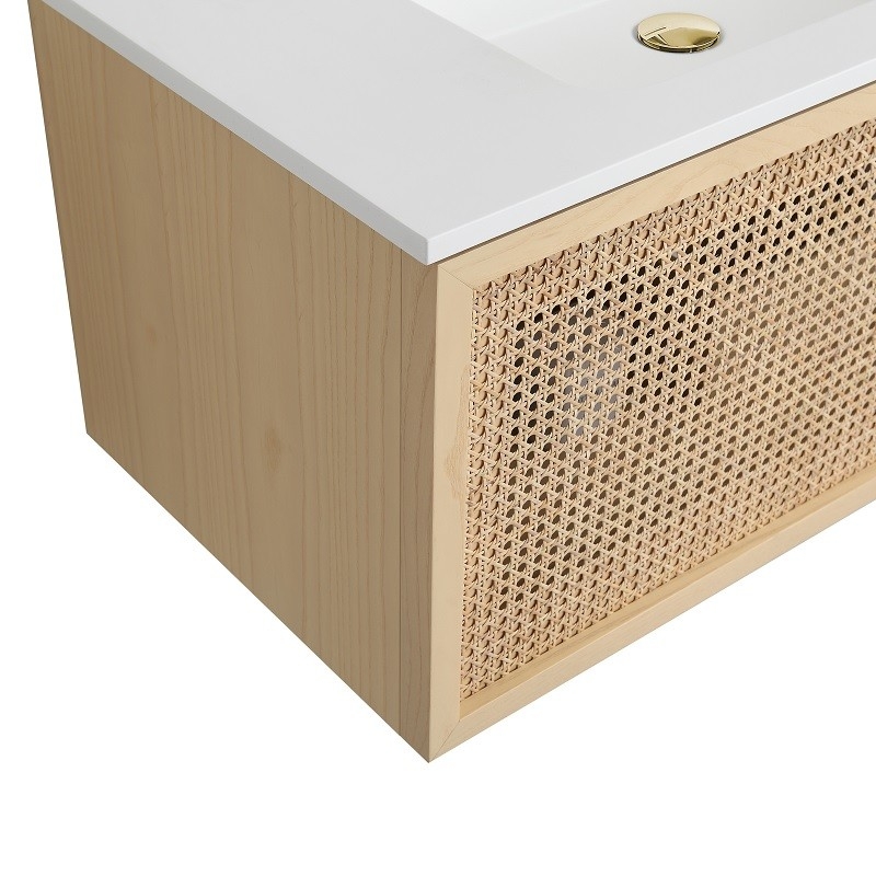 Notre meuble suspendu Raphia est un choix idéal pour ceux qui cherchent à ajouter une touche de style bohème à leur salle de bain. La vasque en résine, le tiroir à fermeture amortie et la fixation murale en font un choix pratique et fonctionnel pour les petits espaces de bain. Le meuble Raphia est fabriqué avec des matériaux de qualité supérieure (placage en bambou et véritable cannage naturel) pour garantir sa durabilité et sa résistance à l'eau et à l'humidité.