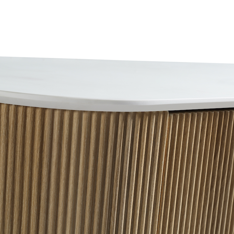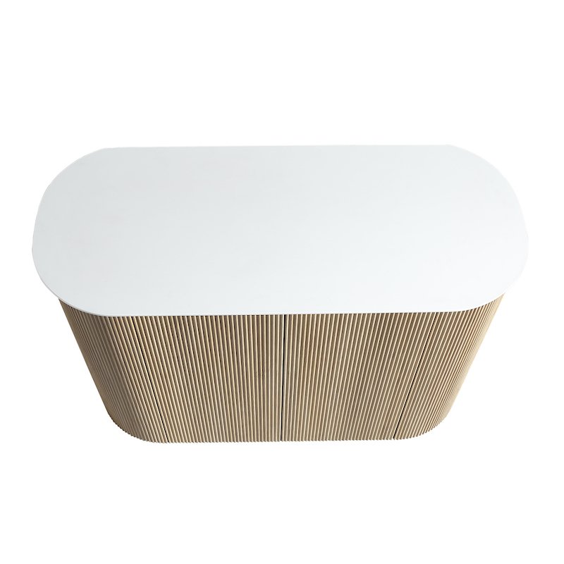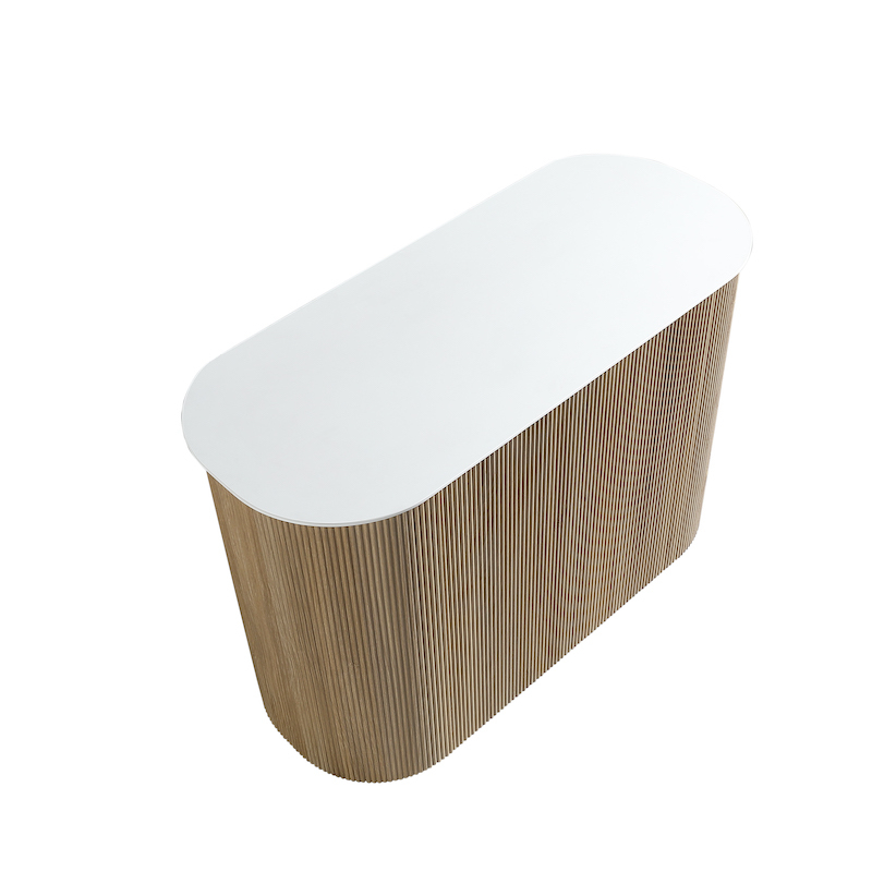 Ses côtés arrondis en demi-cercle, bien qu’inaccessibles pour le rangement, jouent un rôle structural essentiel, assurant la solidité et la stabilité du meuble.
