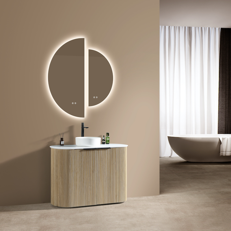 La salle de bain s’inscrit dans la tendance des motifs ondulés avec le meuble sur pieds Tressé 110 x 75 x 46 cm, dont la façade gaufrée se distingue par de fines stries verticales arrondies. Son design tout en courbes adoucit la silhouette du meuble.