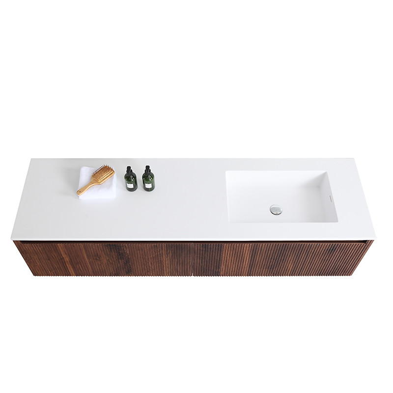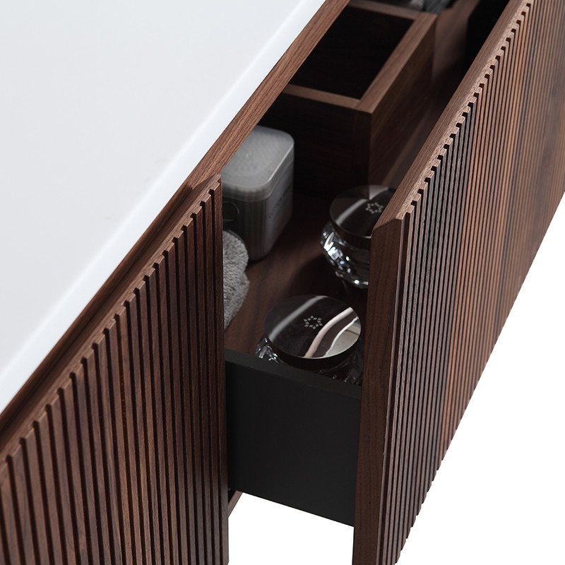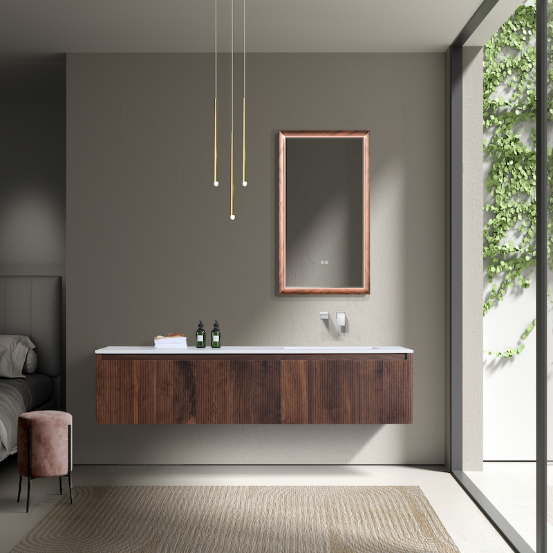 Découvrez notre meuble de salle de bain suspendu Tosca 180 cm en veritable bois de noyer, avec une façade de tiroir en relief cannelé. Avec ses caractéristiques haut de gamme et son design élégant, le meuble Tosca 180 cm est la pièce maîtresse qu'il vous faut pour votre salle de bain !