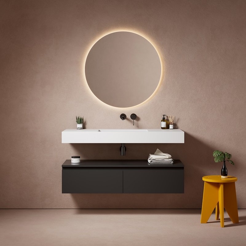 La vasque suspendue Sisa est centrée au milieu du plan vasque, laissant un espace libre des deux côtés de la vasque pour entreposer le linge de toilette. Afin de vous laisser le choix de la robinetterie, le plan n'a pas été percé. Libre à vous d'encastrer ou de poser votre mitigeur pour un rendu personnalisé.