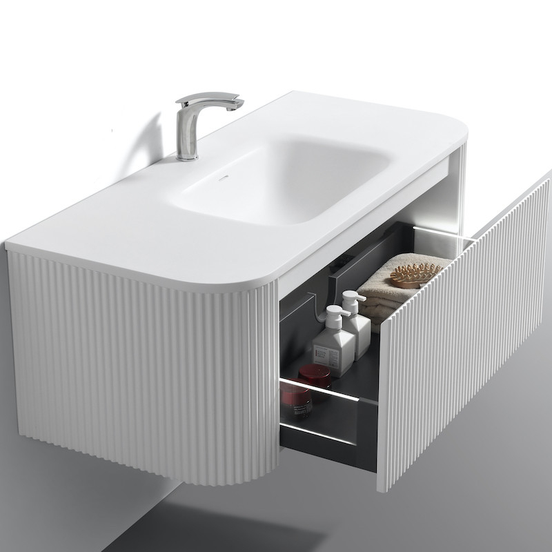 Le meuble de salle de bain Ark Curve blanc mat 120 cm possède une façade cannelée, une vasque en acrylique élégante, et un tiroir avec LED.