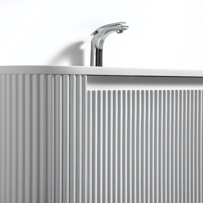 De plus, le meuble est couronné d'une vasque moulée en acrylique blanc mat. Son contour doucement arrondi lui confère une élégance indéniable, tout en facilitant son entretien en éliminant les coins rectangulaires où la poussière peut s'accumuler.