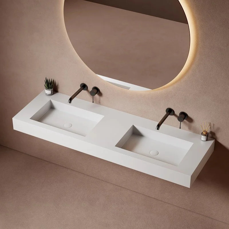 La double vasque murale Sisa, en solid surface blanc mat, allie élégance et praticité. Offrant deux dimensions : 120 et 150 cm, elle permet une utilisation simultanée, avec une qualité durable.
