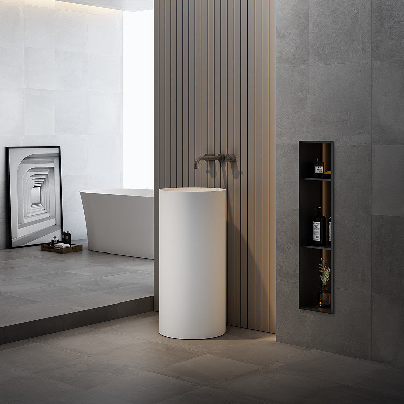 La vasque sur pied Rotondo est conçue en solid surface et corian. Ce matériau n'est ni cassant ni fragile, ce qui rend ce lavabo totem à poser blanc mat très résistant. La surface solide retient mieux la chaleur que l'acrylique ou la fonte, tout en donnant un toucher ultra doux.