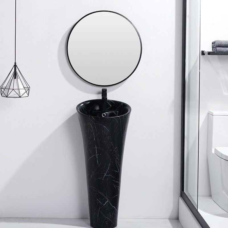 Ce lavabo colonne en céramique effet marbre noir est un allié puissant pour organiser les volumes et offrir un look audacieux à votre pièce.