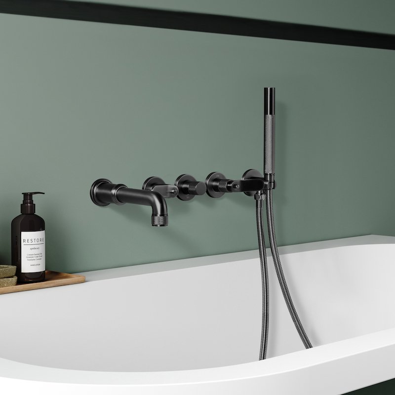Le mélangeur encastrable de baignoire Titane allie parfaitement design industriel et fonctionnalité. Son revêtement gun métal PVD assure une robustesse et une durabilité exceptionnelles, tandis que les détails crantés minutieusement travaillés sur les poignées, le bec et la douchette ajoutent une touche élégante et précise.