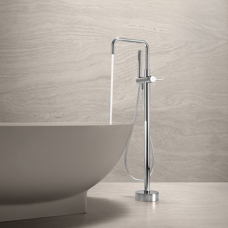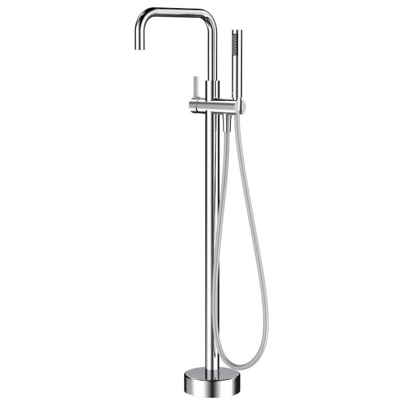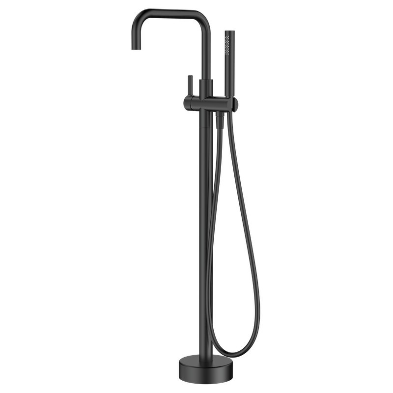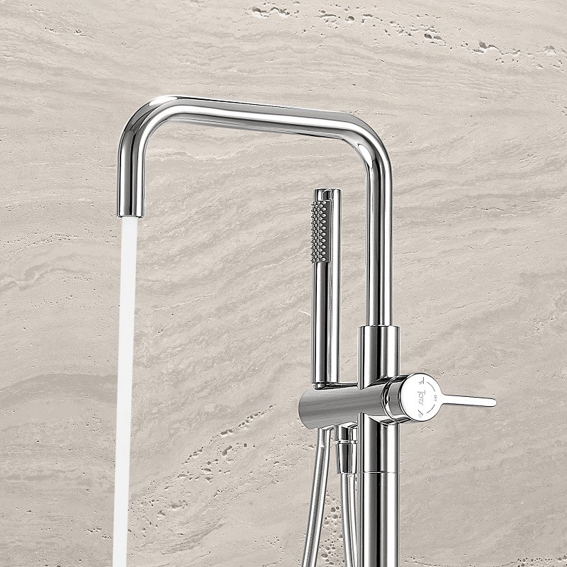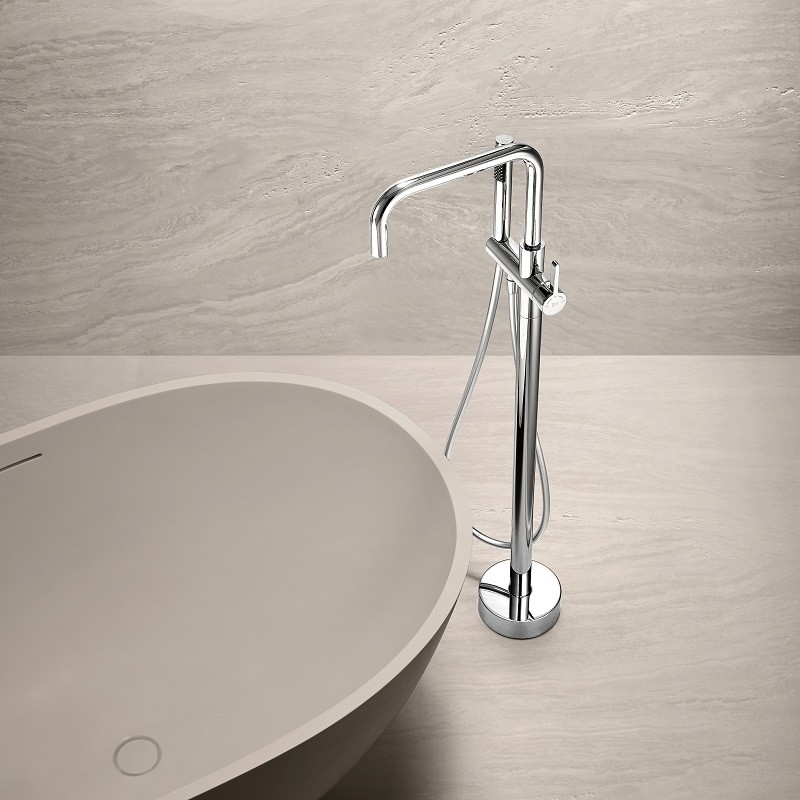 Ce mitigeur sur pied pour baignoire îlot, au design minimaliste et élégant en col de cygne, est composé dune douchette à main et d'un bec de baignoire. Disponible en chrome brillant, noir mat et doré brossé, il allie robustesse et esthétique, parfait pour une salle de bain moderne et raffinée.