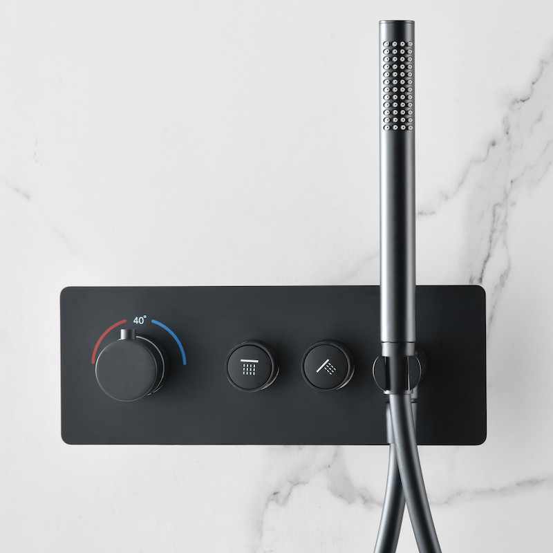 - Un robinet de douche encastrable et son support de douchette à main : ce mitigeur innovant, équipé de boutons Push pour une sélection aisée du mode de sortie d'eau, offre une expérience de douche optimale tout en économisant l'eau grâce à sa fonction de débit réglé. Il intègre également un cran de sécurité à 40°C pour prévenir les brûlures. Avec une cartouche thermostatique de qualité supérieure de la marque française Vernet, garantissant une température d'eau constante et éliminant les variations désagréables, ce mitigeur assure fiabilité et durabilité. Son installation est facilitée par le boîtier d'encastrement en plastique inclus.