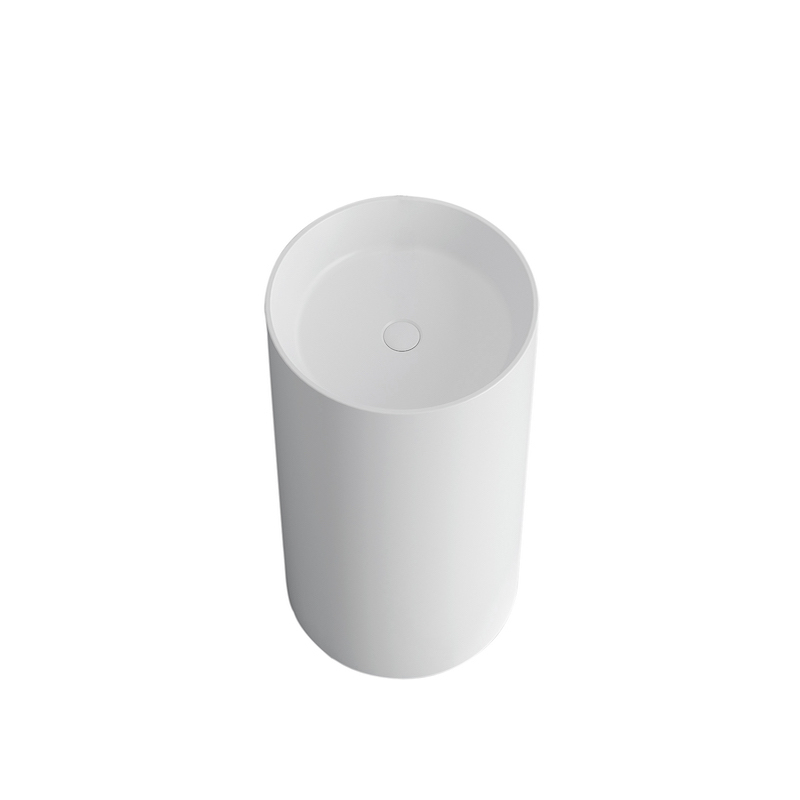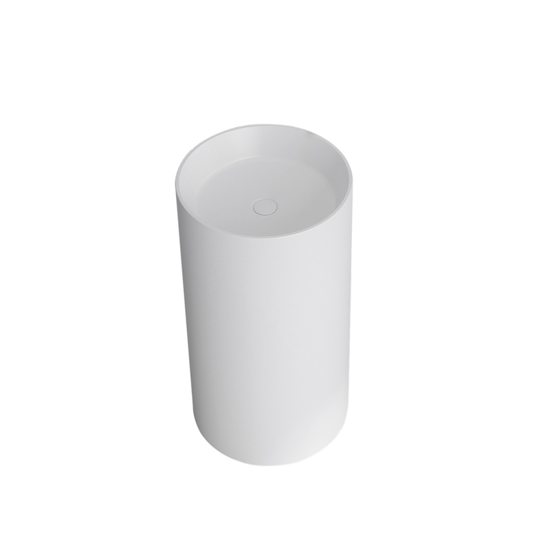 Le lavabo mesure 85 cm de haut et 45 cm de diamètre, avec une cuve de 12 cm de profondeur. Compact et pratique, il se pose directement au sol sans fixation : son poids, associé à un joint silicone et au raccordement au siphon, suffit à assurer une installation stable et durable.